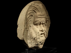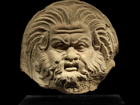 A Western Greek mould-made antefix, possibly from Taranto. It was made of light yellow clay with traces of white slip, and is semi-circular in form. The antefix has a very expressive face of a satyr, executed in deep relief. His eyebrows, visible under a furrowed brow, are angular and pointing upward. He has a full beard comprising many wavy strands, and long hair that falls down in an arc on either side and stands up straight in the middle.