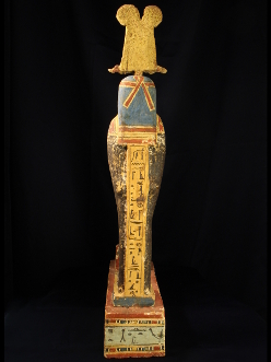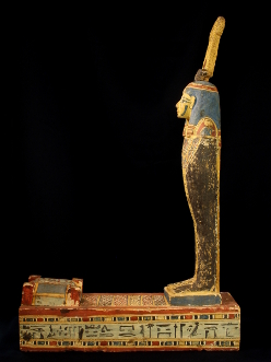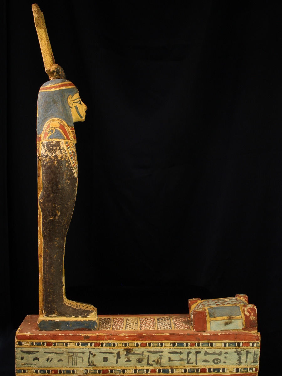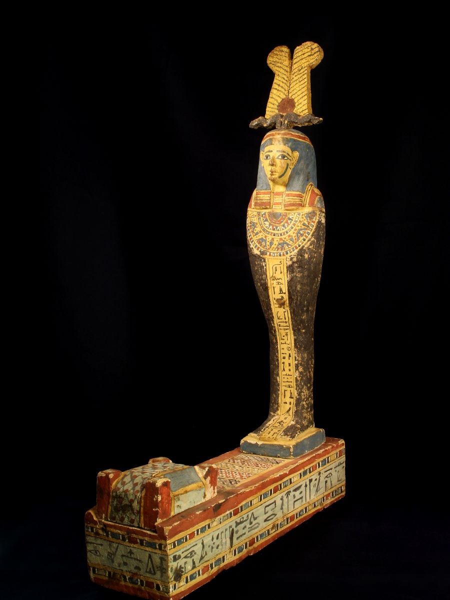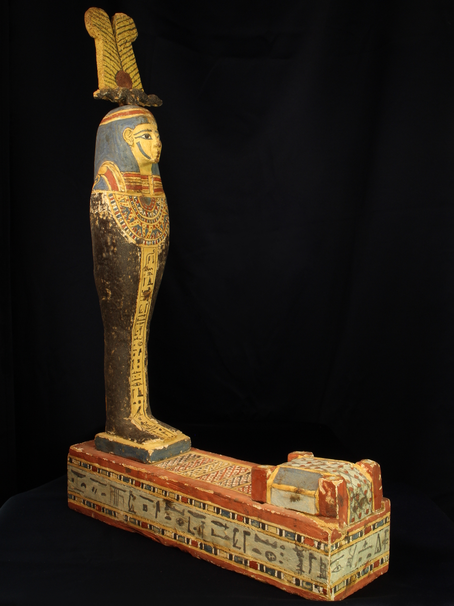 The mummiform body is painted black, with a finely painted multibeaded floral collar with falcon-headed terminals, the face painted yellow with a blue tripartite wig, a feathered crown with ram's horns and a central sun disk on its head, standing on a rectangular plinth with a cavity which is covered by a miniature sarcophagus, both the figure and the plinth inscribed with funerary texts, mentioning the name of the owner, Padiherpakhered.