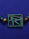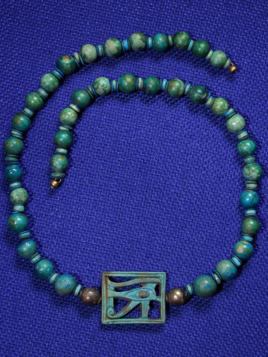 A wonderful glazed necklace consisting of 36 ball beads made of Egyptian turquoise faience, interspersed with sets of 3 small lentoid faience beads; in the centre, surrounded by two silver beads, is a beautifully designed rectangular wedjat eye pendant, which is openwork, double-sided and two-toned.