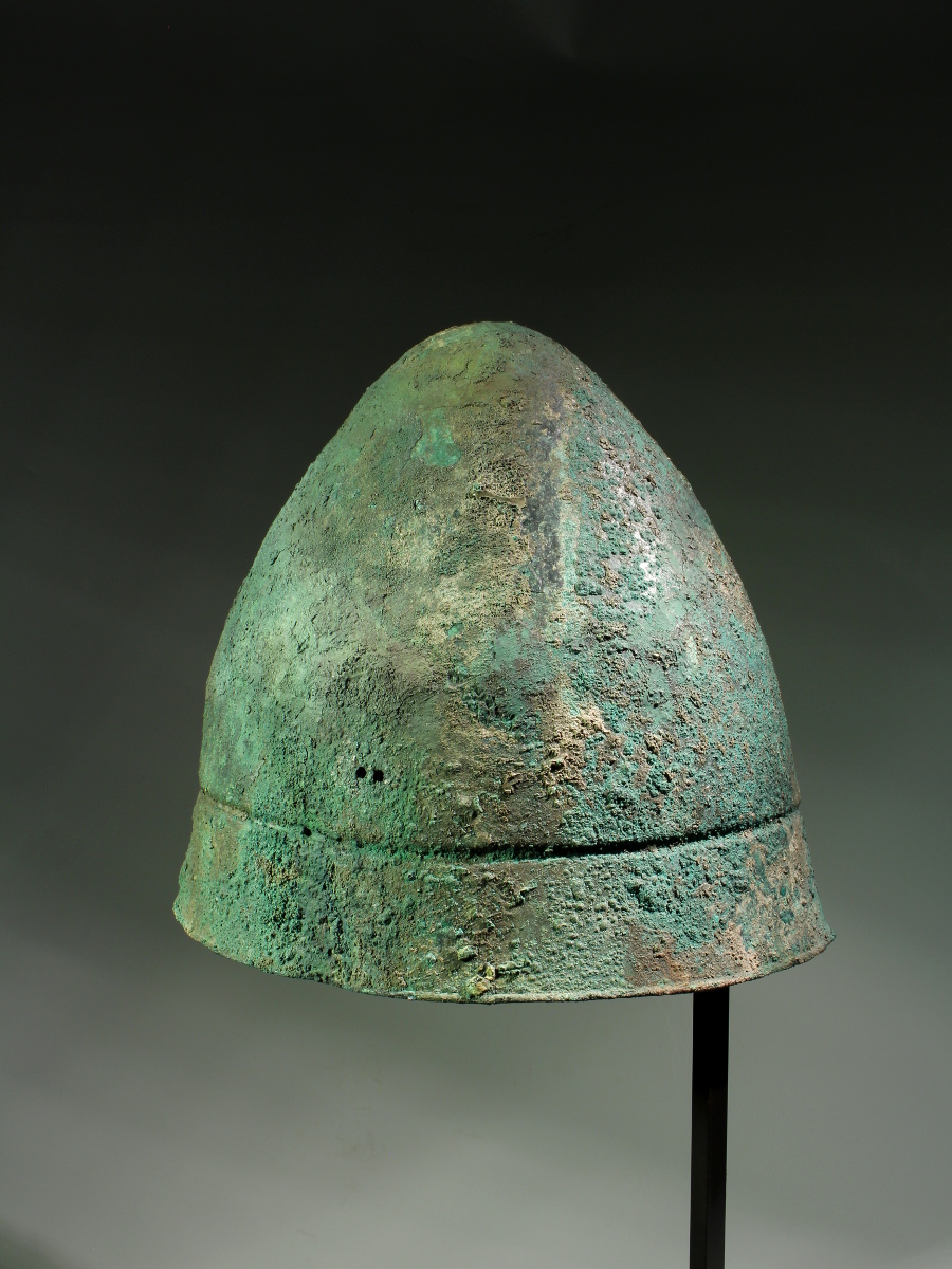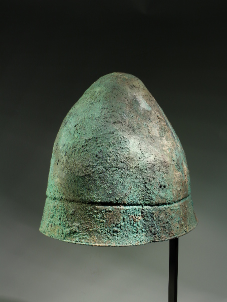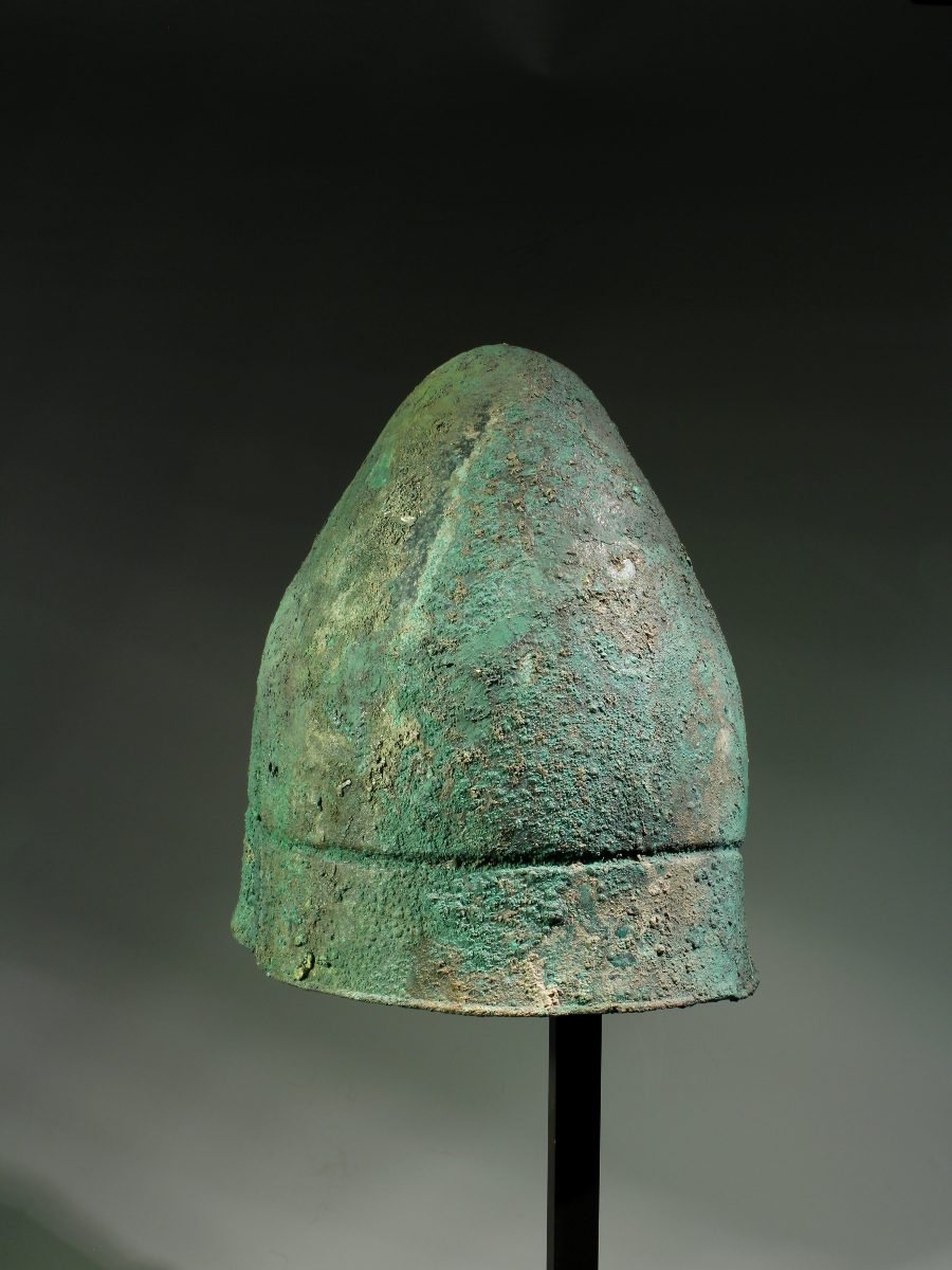 A conical helmet of hammered bronze, which has a single groove in its lower part, encircling the whole helmet. This creates a sort of broad brim, rounded at the bottom edges. It has been suggested that the groove imitates the leather thong that was usually sewn into its felt prototype for adjustment. On both sides of the helmets a few small holes served to attach a chin strap.