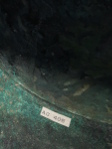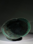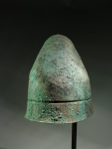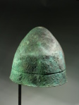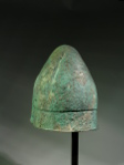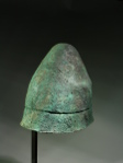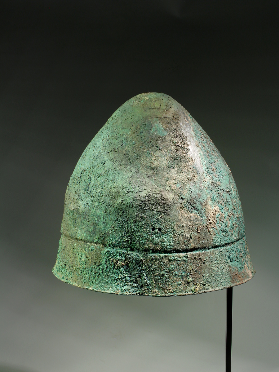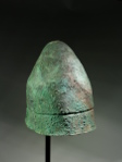 In a slightly bent shape, most likely as found; a few spots of restoration in the cap, reinforced on the inside with glass fabric; with a beautiful rough, dark to blue green patina and uneven surface.