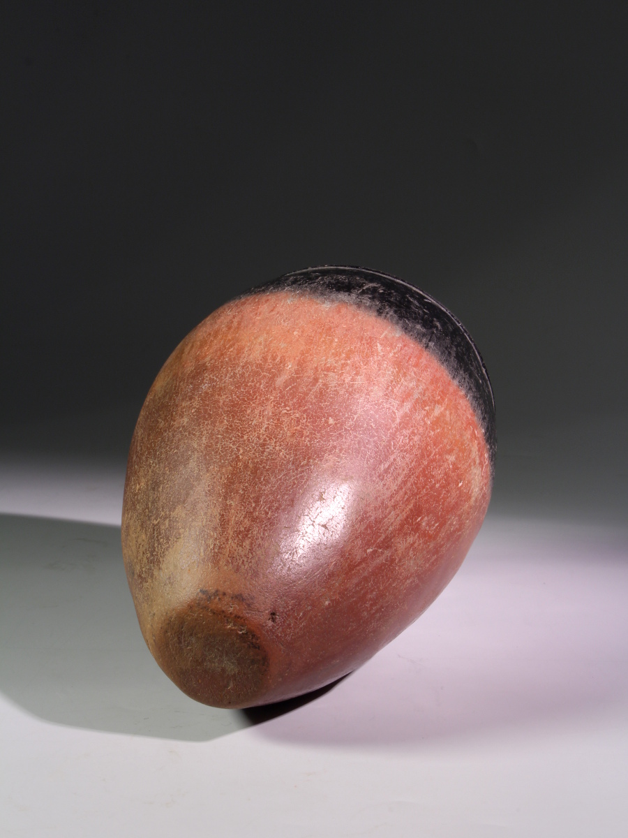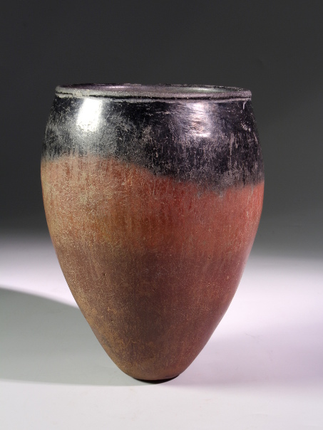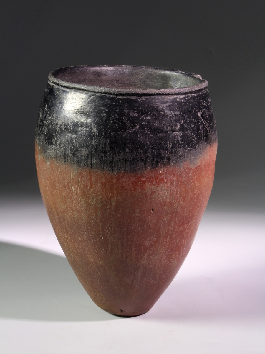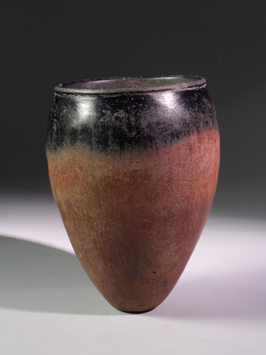An example of pre-dynastic pottery, with a moulded rim, smooth sides and ovoid in shape, tapering toward a narrow base. Such vessels are commonly called black-topped red pottery or B-ware (as classified by Egyptologist W.M. Flinders Petrie) because of their distinctive blackened rim.
