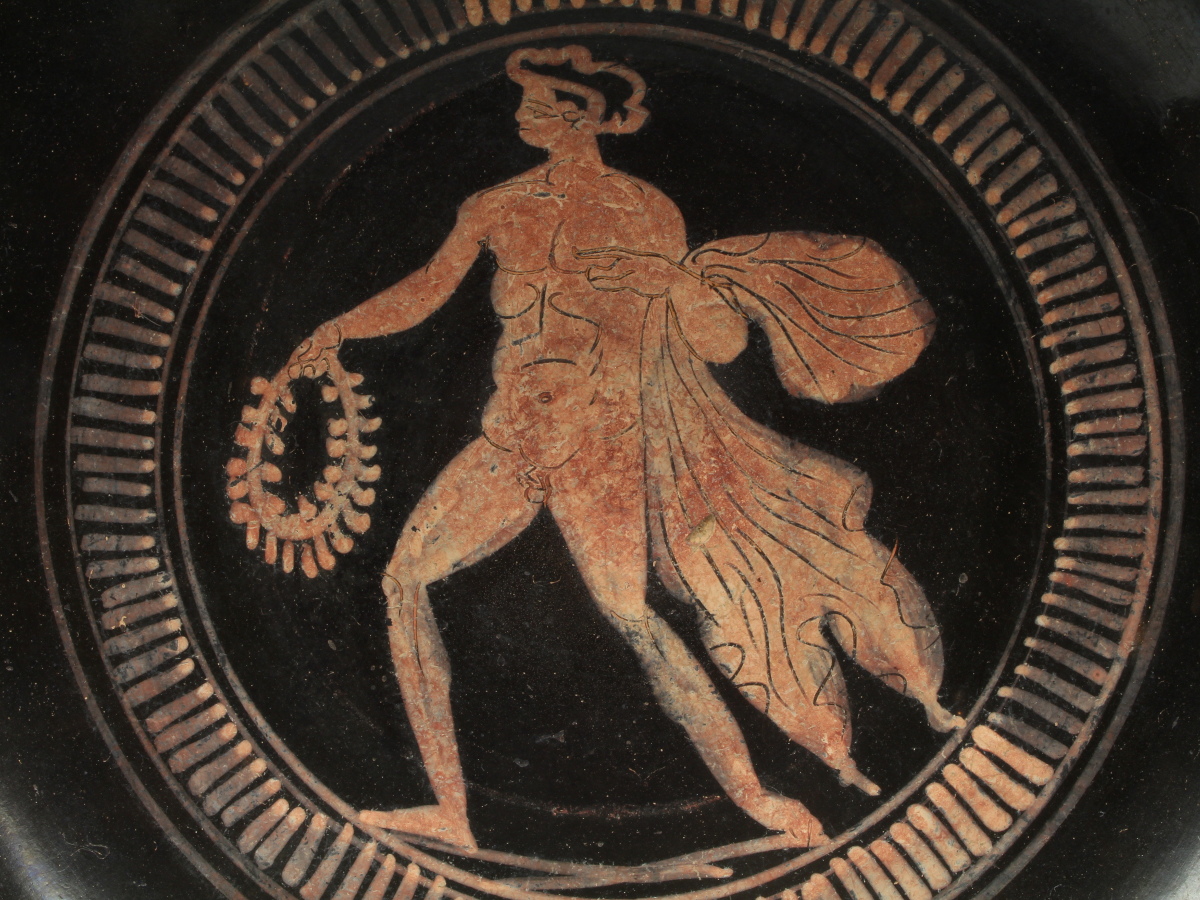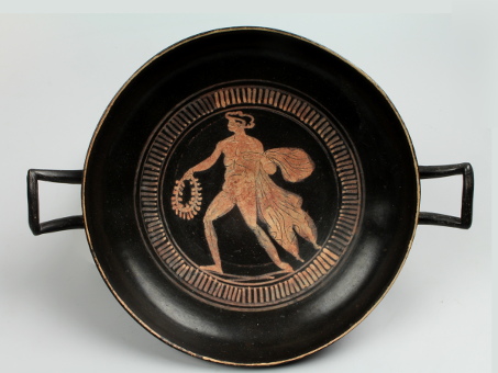 A kylix showing on the tondo the image of an athlete, depicted nude; he is carrying a chlamys or cloak, which is draped over his left arm, and has a wreath in his right hand.