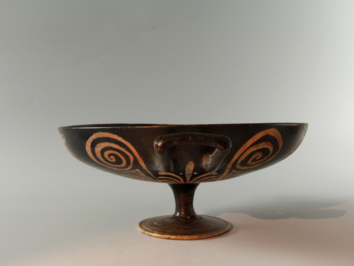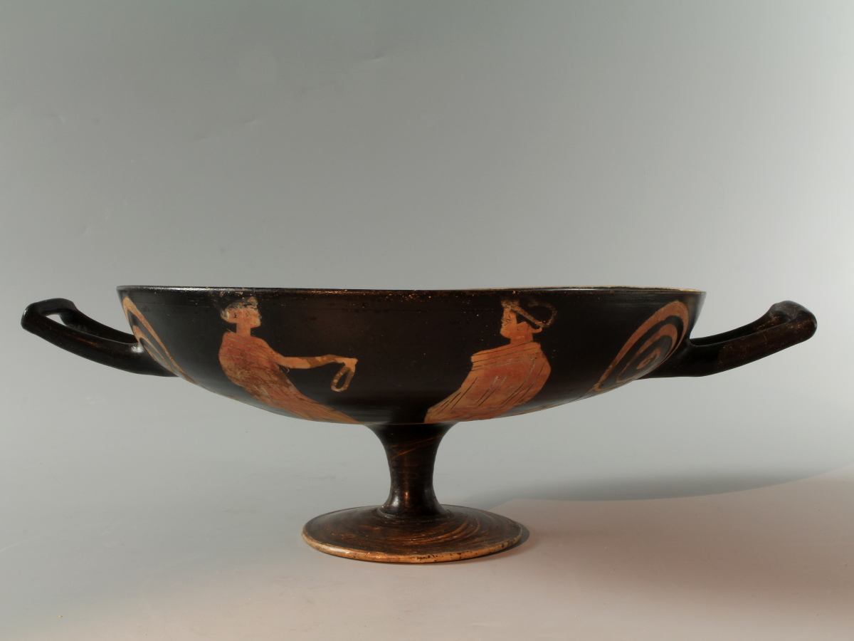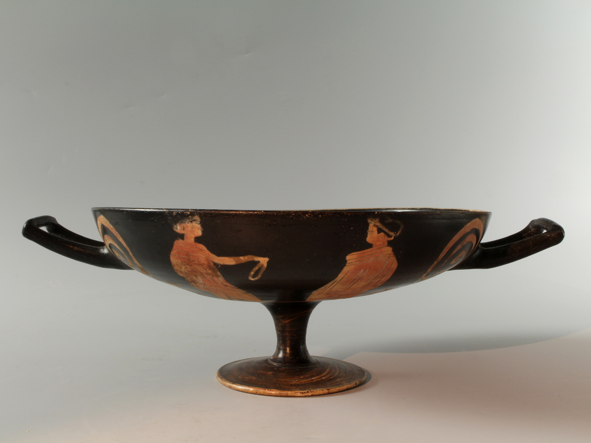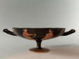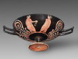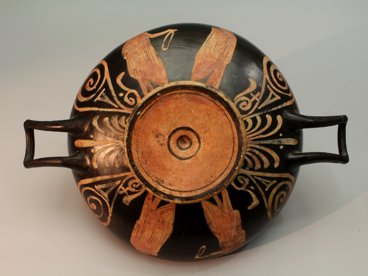 The kylix was decorated in a special technique called superposed red: figures are painted in a red slip which is applied over the black painted vase. Then interior details of the illustration are incised through the red using a sharp instrument, so that the black of the surface beneath shines through.