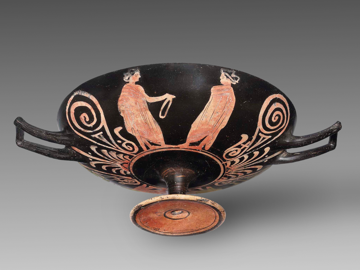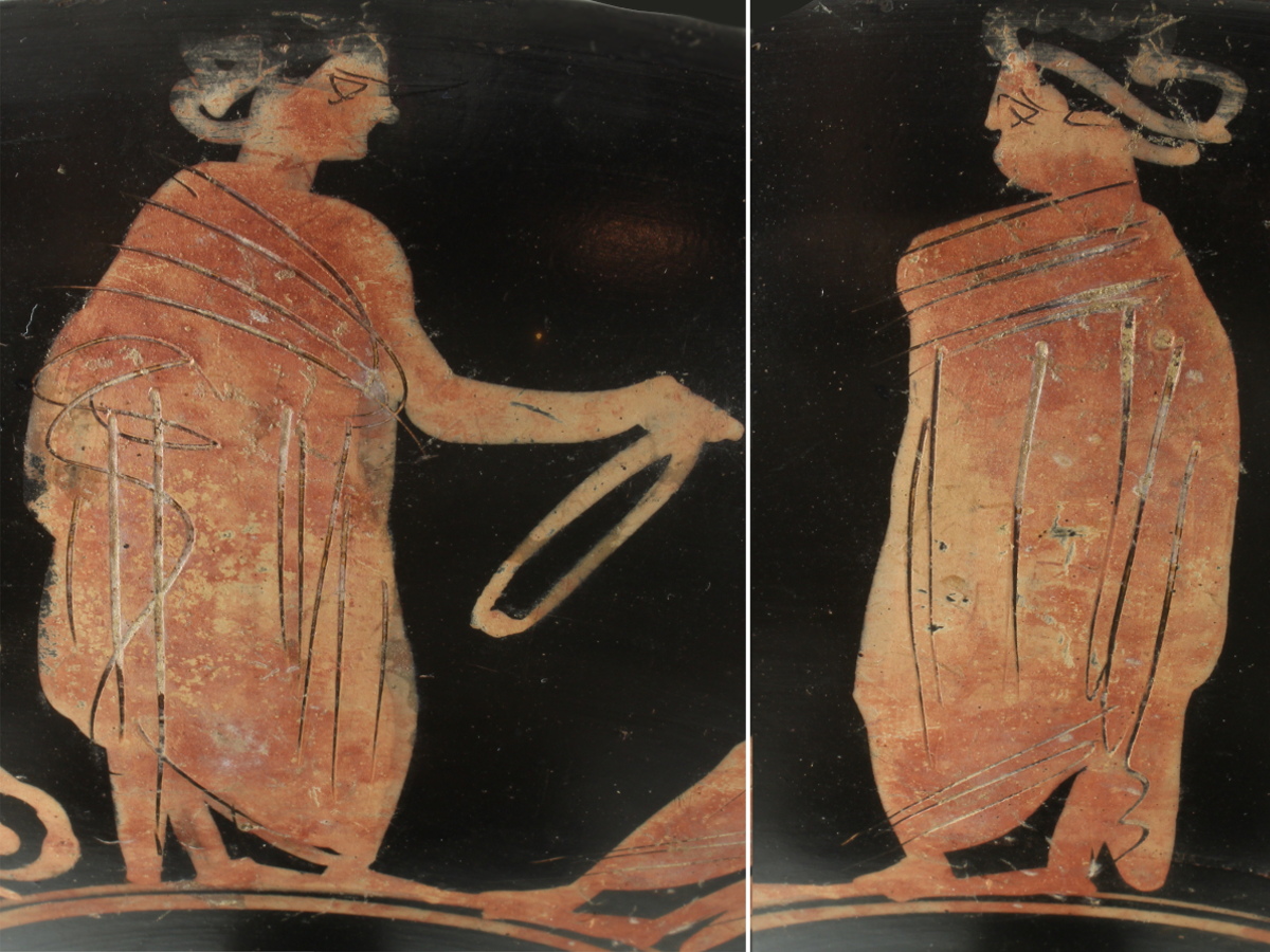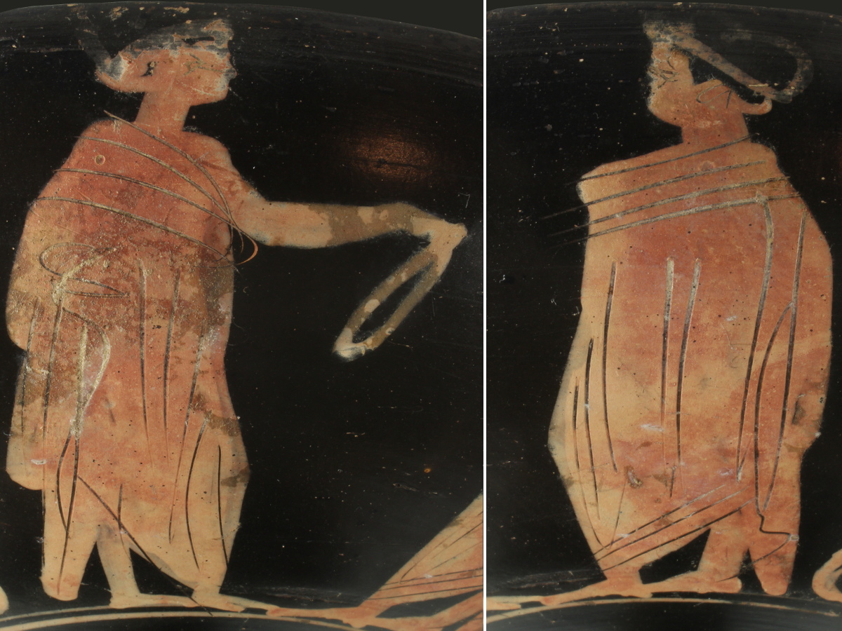 The exterior of the kylix is decorated on each side with two figures that are commonly called “draped” or “mantled” youths. They are wearing a himation or mantle, and the figure on the left is holding, or possibly presenting, a wreath. A floral decoration occupies the space below and around the handles, consisting of palmettes with enlarged scrolling tendrils.
