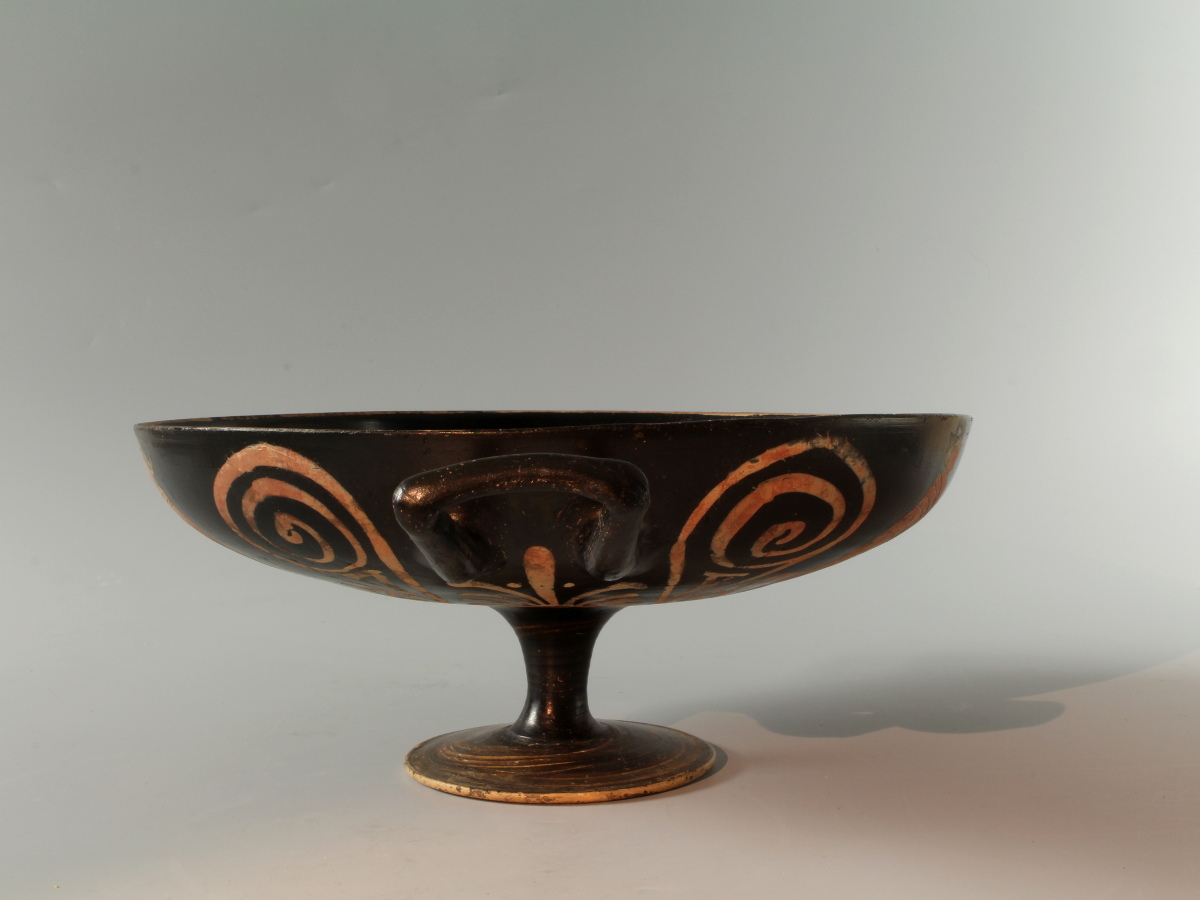 The bowl and the handles are intact. The foot has been repaired from several fragments with over-painting along the break lines. Overall very minor surface wear, some fading to the painted decoration. A minor chip to the surface in the lower section of the drapery. Some pitting and scratches that do not detract.