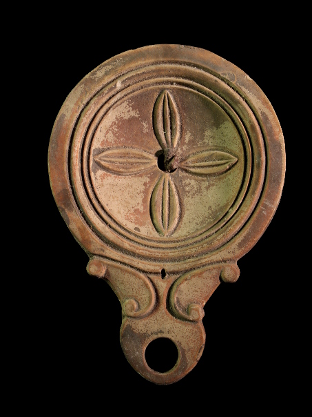 This is a Roman moulded terracotta oil lamp, coming from the Central Mediterranean area, either Italy or North Africa. The discus shows floral decoration and has a filling hole.