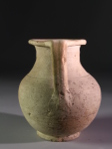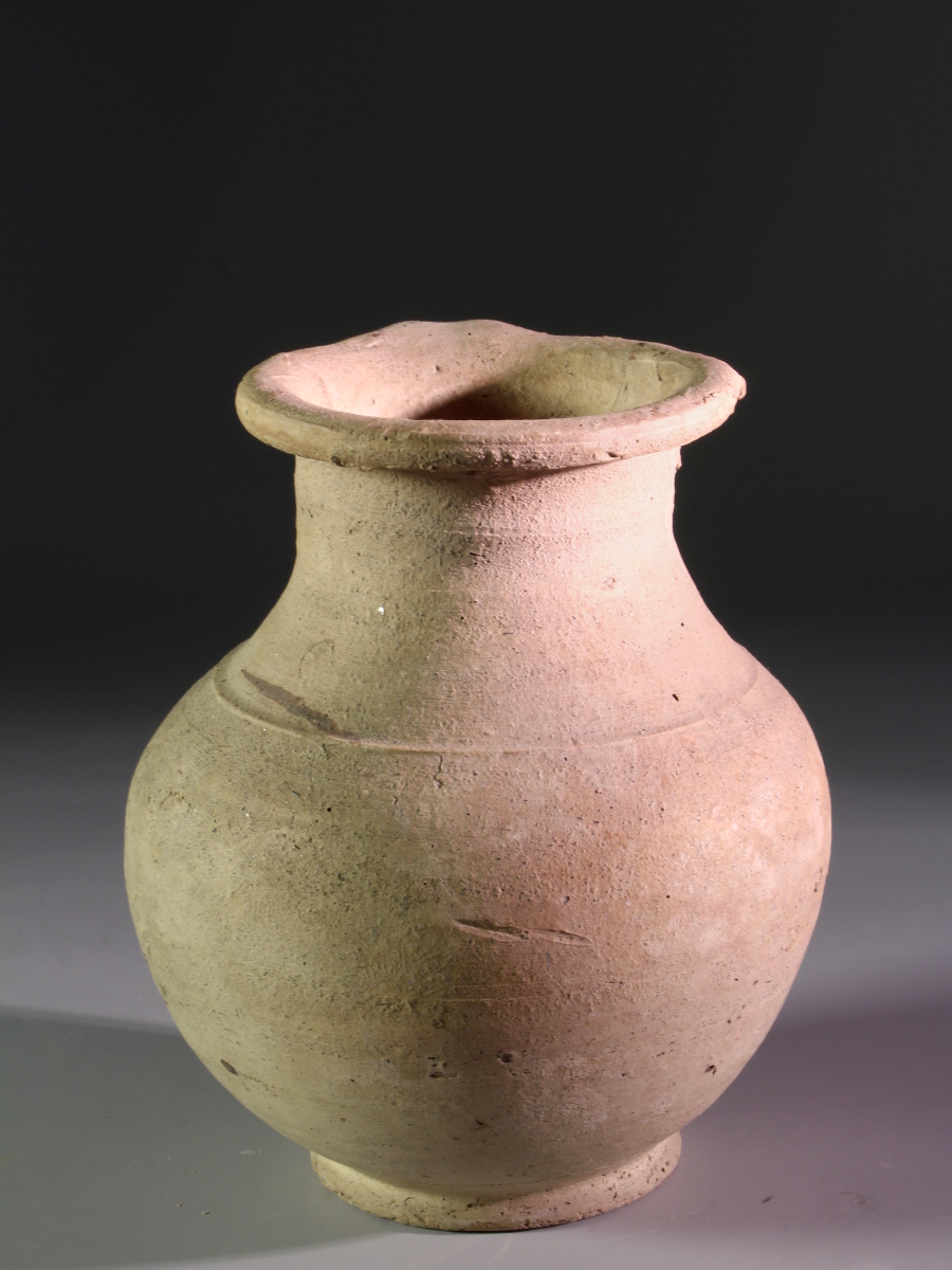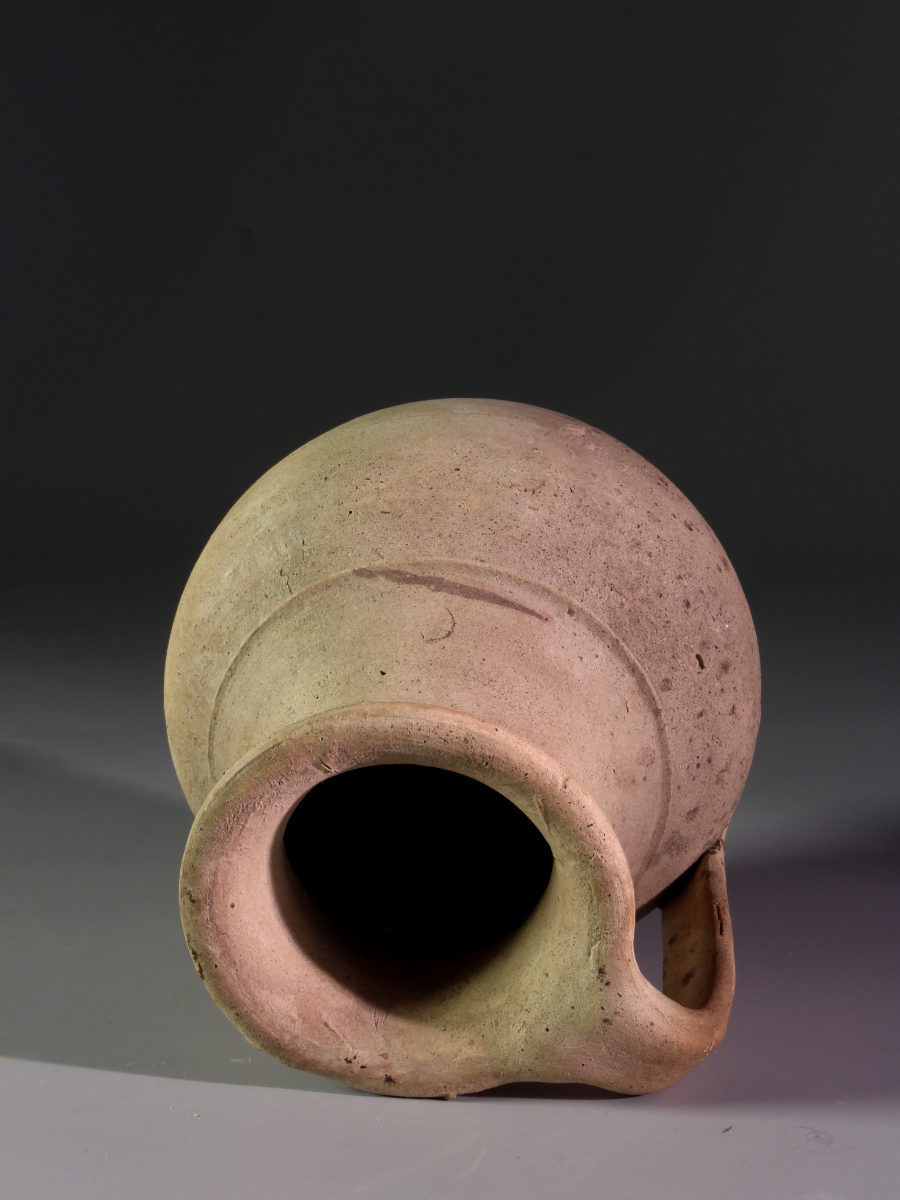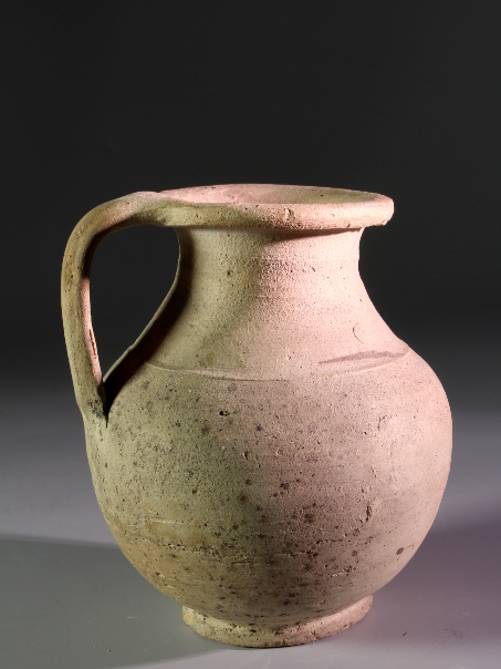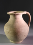 This is a simple clay coloured vessel, consisting of a bulbous body with a single vertical strap handle, which is slightly profiled and which connects the body of the vessel and the rim.