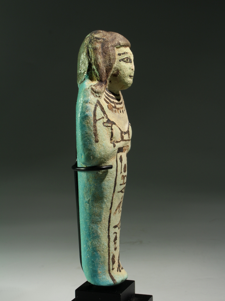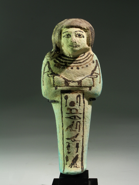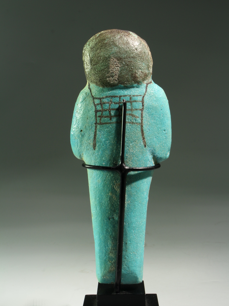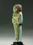 A shabti made of Egyptian faience with details painted, for Hori. He is shown mummiform with only his hands and head protruding, wearing a short wig with sidelock, identifying him as sem priest, a title that was usually worn by the high priest of Ptah. The figure holds the usual agricultural implements in his hands and carries a seed bag on his back. He also wears a broad collar, consisting of several layers or strings. The text on the shabti informs us about the titles and name of the owner: The illuminated one, the Osiris, the sem priest, the greatest of the directors of the craftsmen, Hori.