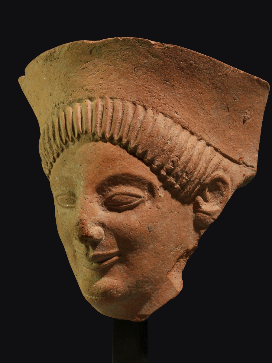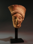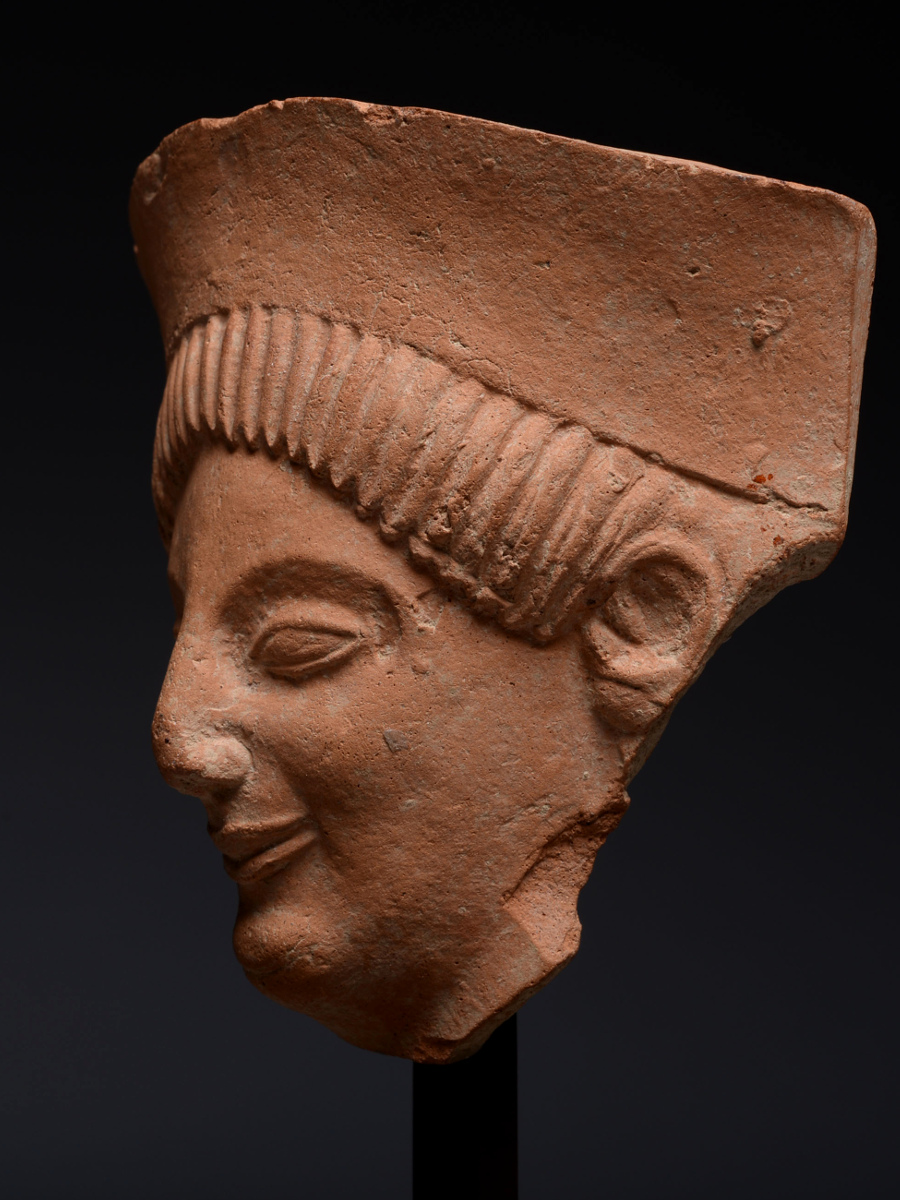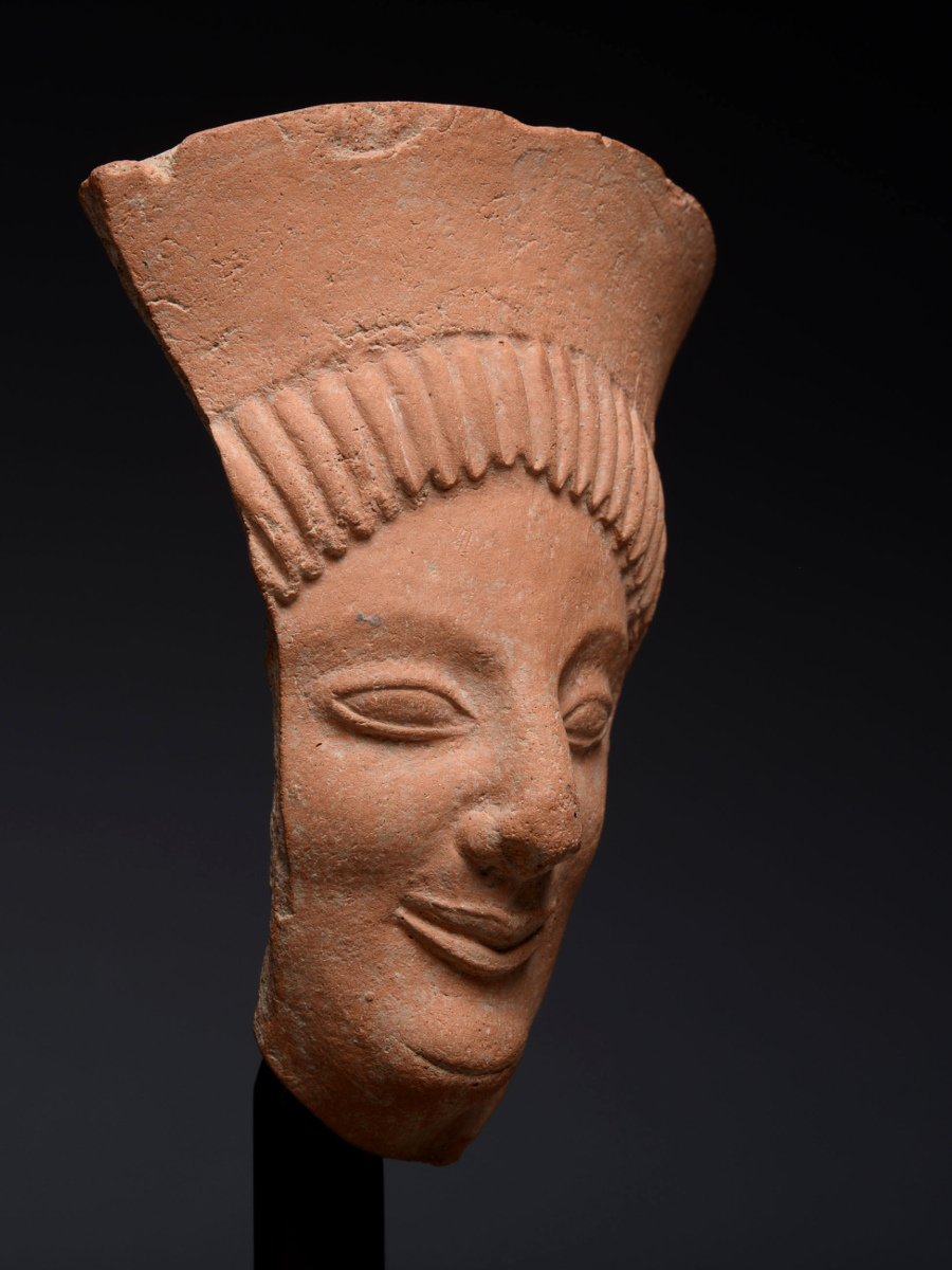 A lovely Greek terracotta fragment, depicting the face of a woman or more likely a goddess, who is smiling. This is the so-called "archaic smile" which is characteristic of the Archaic Period (circa 650 – 480 B.C.), more specifically the second quarter of the 6th century B.C. There have been several explanations for the smile; many think that for the Greeks it reflected a state of well-being, but technical reasons have also been suggested.