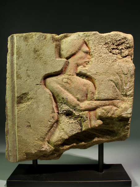 The fragment comes from a so called talatat block. Early in the reign of king Amunhetep IV / Akhenaten (circa 1353–1336 B.C., the first monarch in history who was a monotheist) the use of stone blocks of a standardized size was introduced for the construction of temples and palaces in Karnak and el-Amarna, making the building work easier. These blocks were roughly 55 x 25 x 25 cm (1 by 0.5 by 0.5 Egyptian cubit). After the death of Akhenaten the use of these blocks was abandoned, and the temples that he built were quickly dismantled, as was his newly founded capital Akhetaten. Within a generation of Akhenaten’s death almost everything had disappeared, and the tens of thousands of blocks were reused in other constructions, as filler material for temple pylons, and as foundation blocks for large buildings; in Hermopolis alone some 2,000 blocks from buildings that originally stood in neighbouring Akhetaten have been found, and in Thebes, which was the capital of Akhenaten during his first years on the throne, more than 100,000 blocks have been recovered, about a third of them decorated with relief scenes.