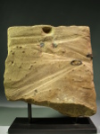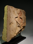 Fragment as shown, with some chipping along the edges and on the surface; overall surface wear with some pitting and scratches. Some flaking to the pigment, and with some naturally occurring salts in a few areas. A shallow groove at the waist of the body. The remnants of two metal screws from a previous mount are visible on the back. Professionally mounted with two metal tangs drilled at the bottom of the fragment.