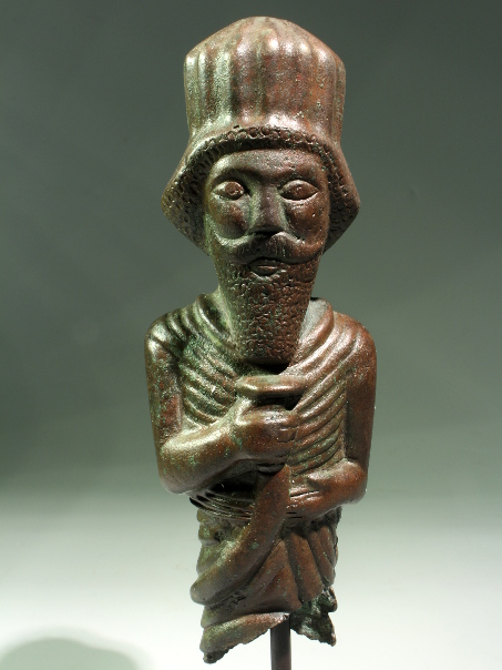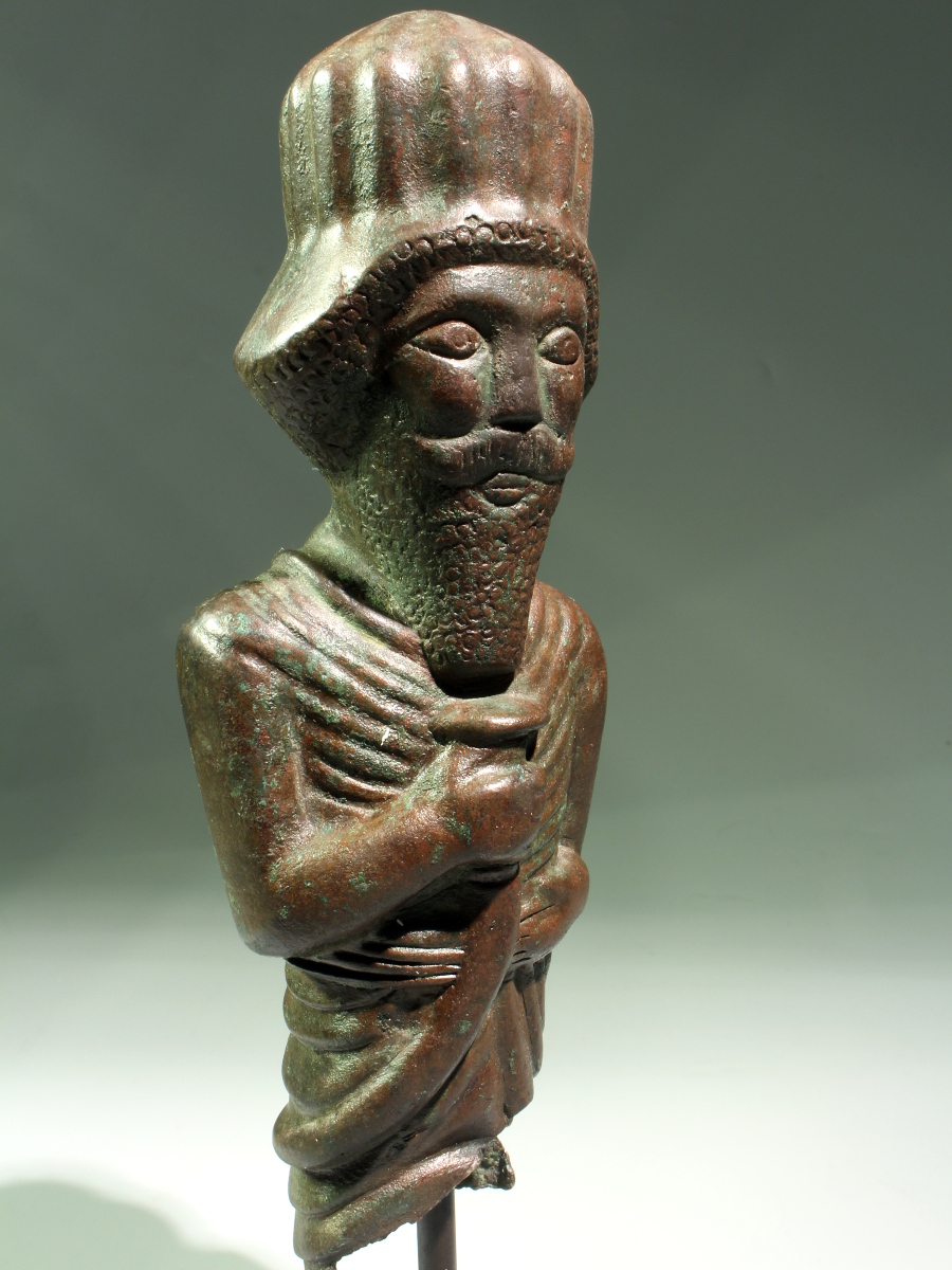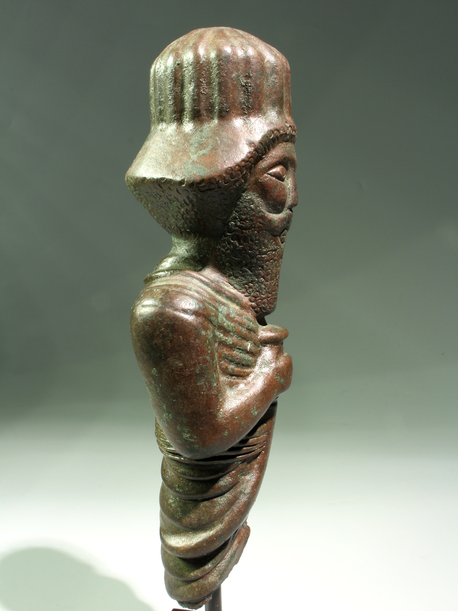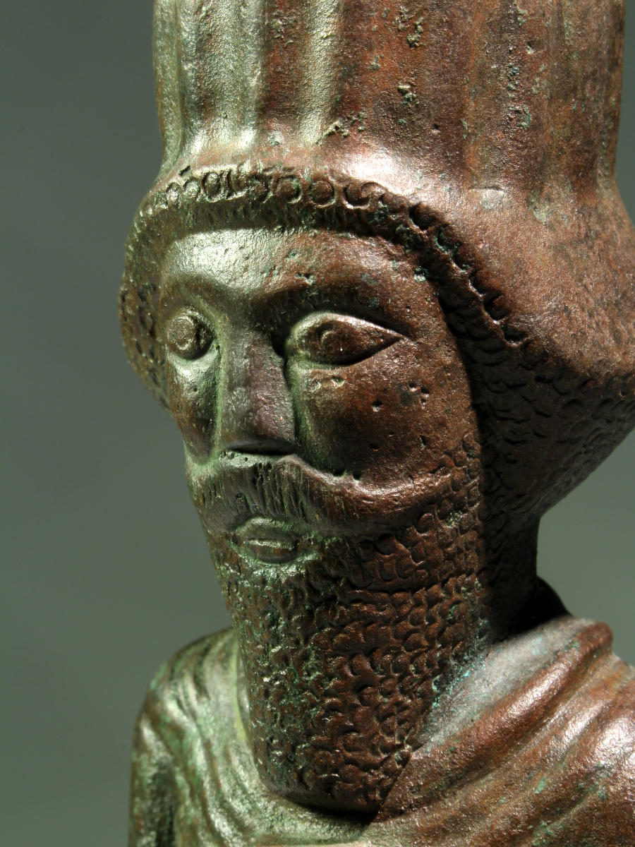 An important and heavy hollow cast figure, depicting a king or a noble. He is wearing a ribbed helmet in the shape of a high dome. His pleated garments are tied around his waist with a belt which consists of five horizontal parts. His long and full beard is tightly curled, as is his hair which appears from underneath the helmet. In his proper right hand he holds a curved sword.