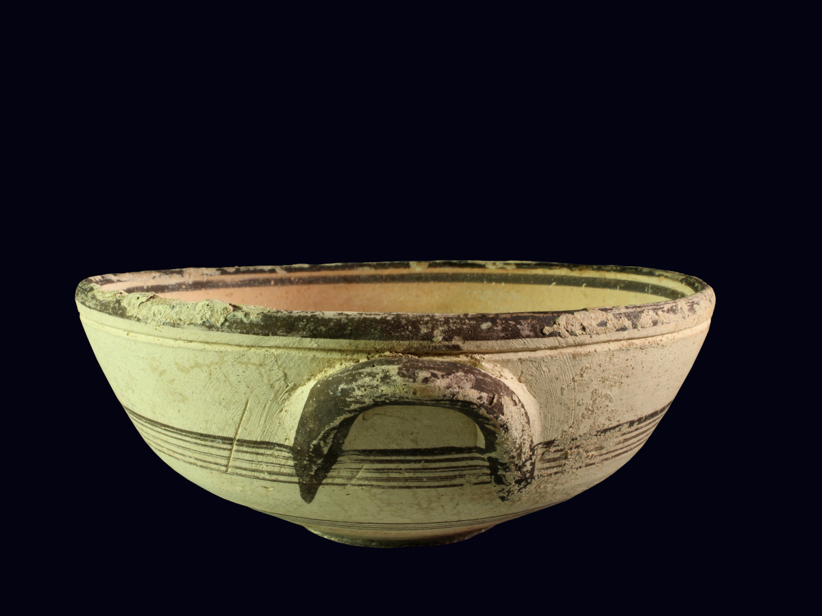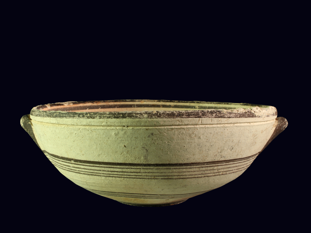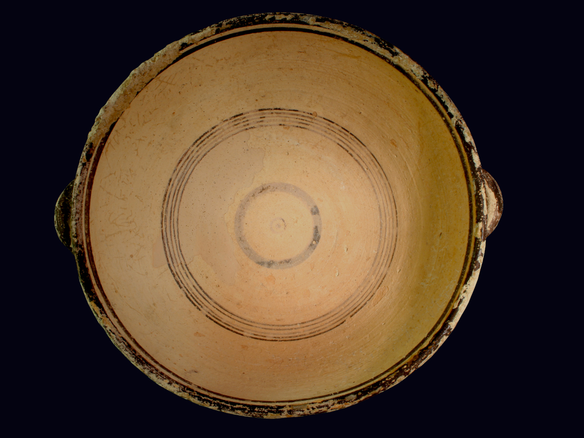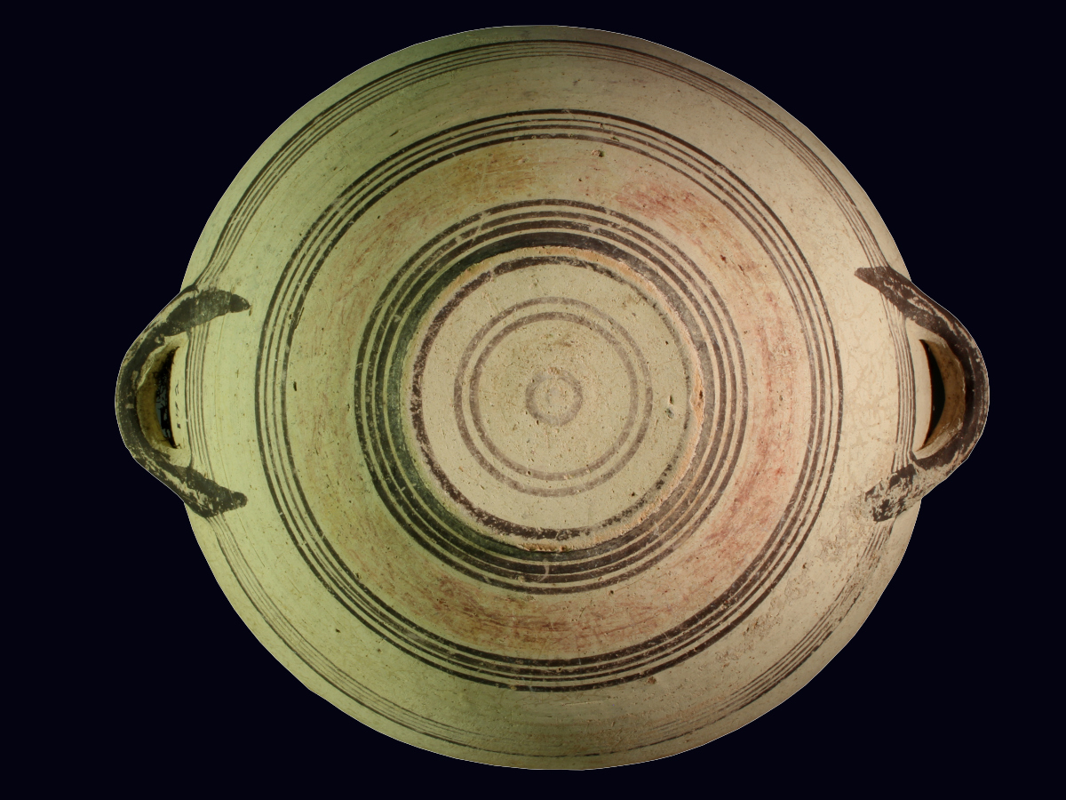 Both the exterior and the interior were decorated in red and black-brown on a background of white slip. The decoration consists of series of thin horizontal concentric circles, both thin lines and somewhat thicker bands.