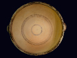 A wide rimmed and steep sided terracotta bowl with two small lug handles and a ring foot.