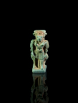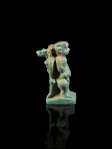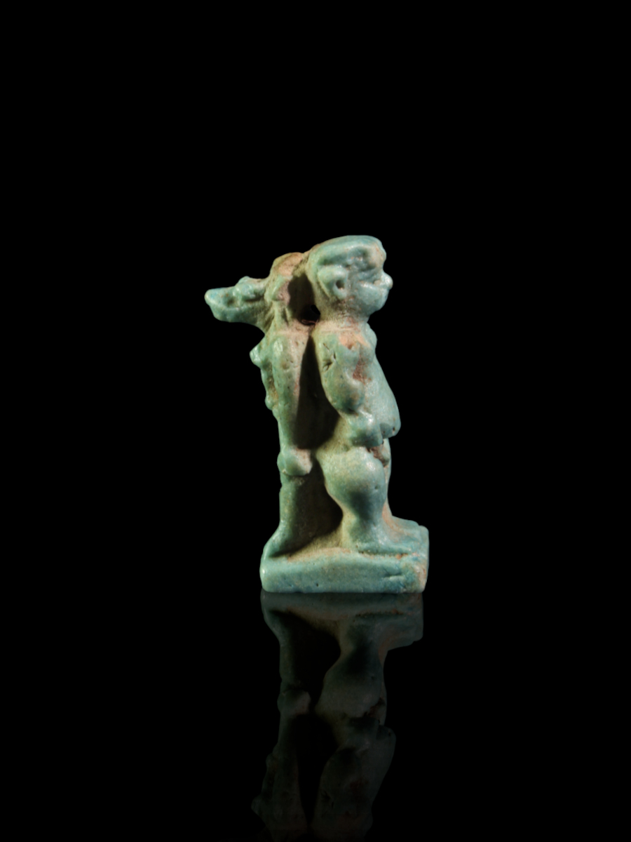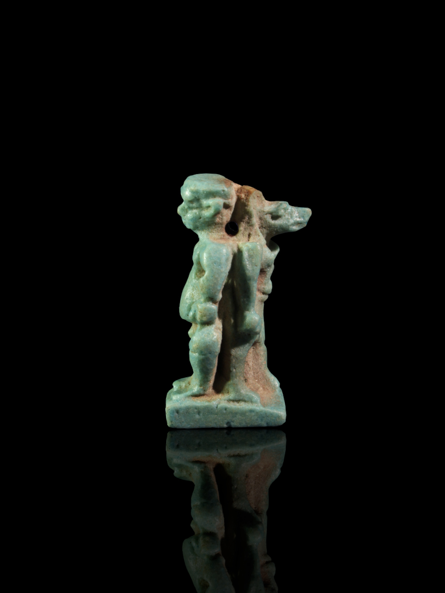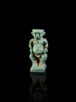 An extremely rare turquoise blue glazed faience amulet showing the gods Pataikos and Anubis, positioned back-to-back.