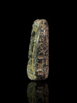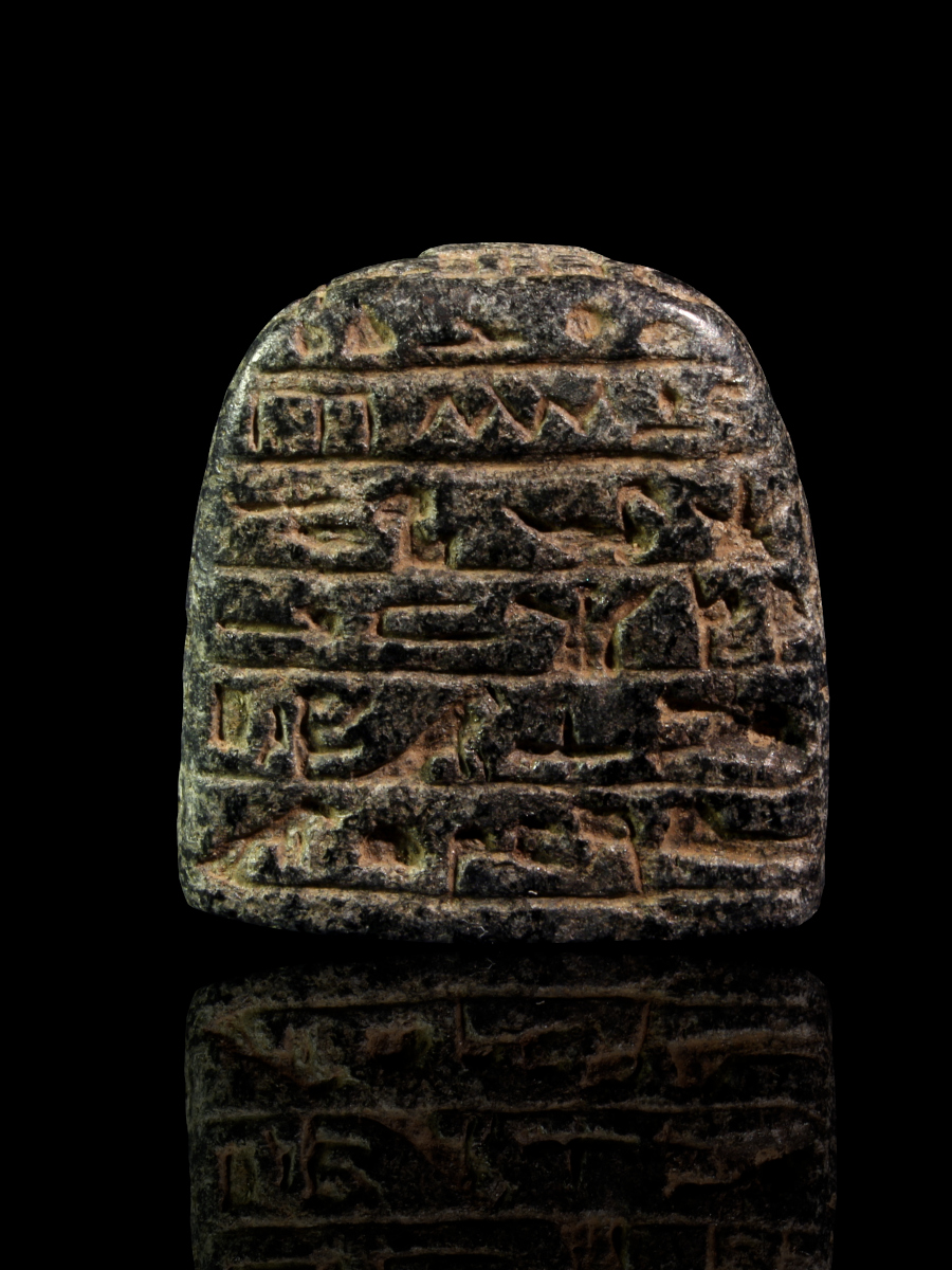 Large stone magical stelae were set up in temple precincts, where water was poured over them to absorb the magic of the images and spells with which they were decorated. When drunk, this water would afford prophylactic protection against noxious animals or cure those who were already stung or bitten (Andrews (1994), p. 38-39). One of the largest, and most famous, is the Metternich Stela in the Metropolitan Museum of Art, New York (Allen (2005), p. 49-63, no. 52). However, it seems likely that small stelae like the one on offer here were used as an amulet, giving magical protection, rather than being used to impart its magic to water poured over it for drinking (Allen (2005), p. 64, no. 54). For such stelae see also Sternberg (1999), vol. I, p. 94f.