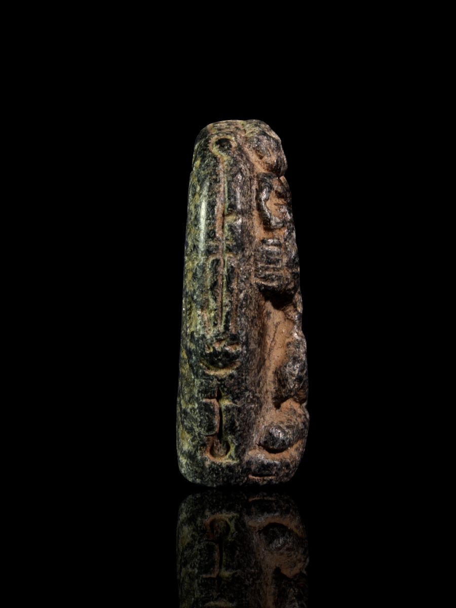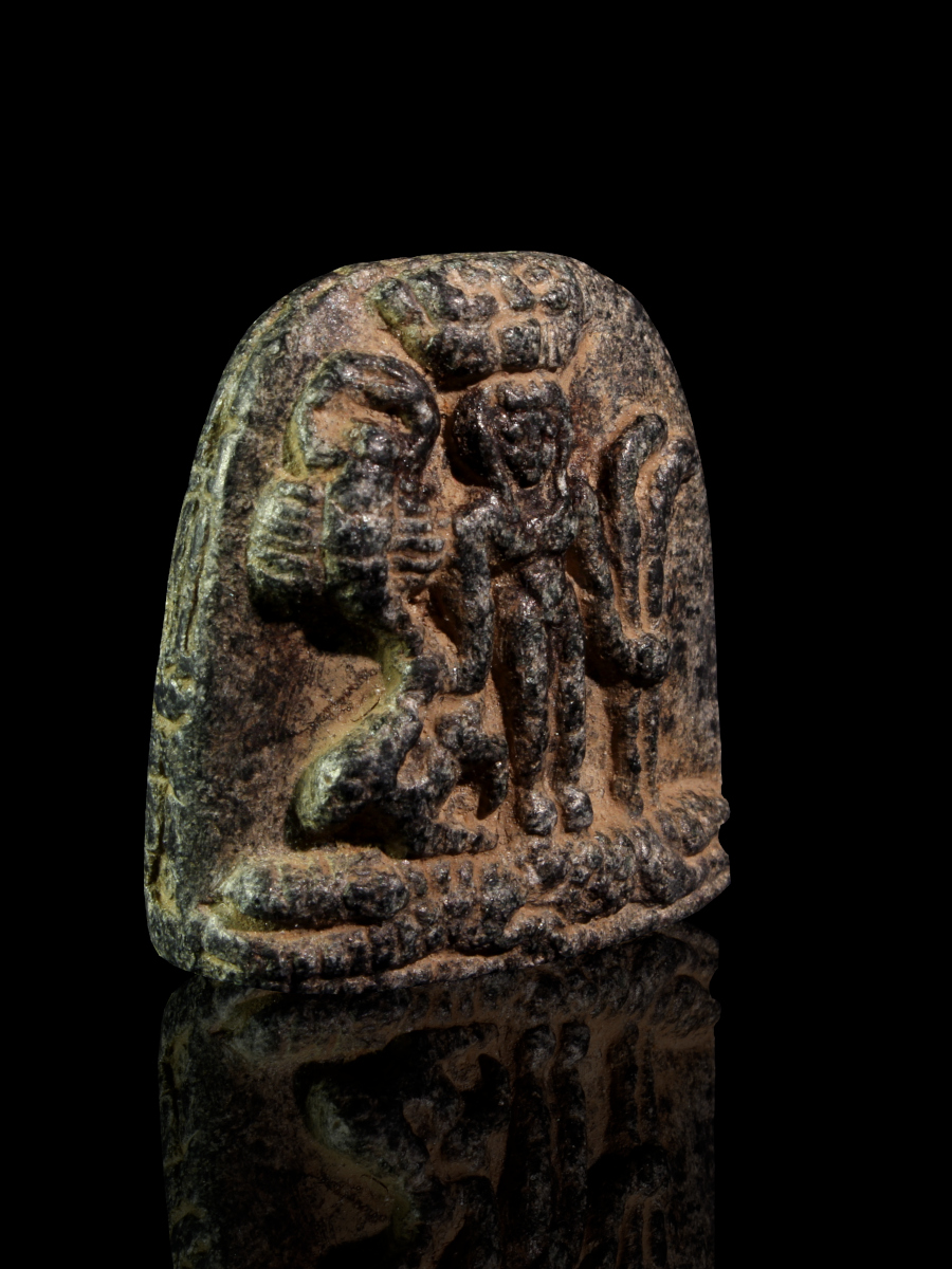 As is often the case with such small, amuletic objects, the scene is somewhat worn, making part of the relief scene slightly indistinct; this was caused by frequent rubbing of the image in antiquity to absorb its magical powers.