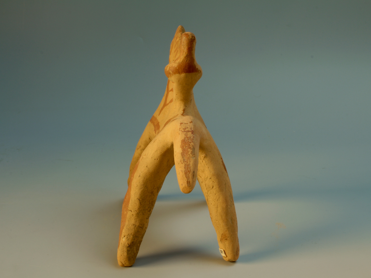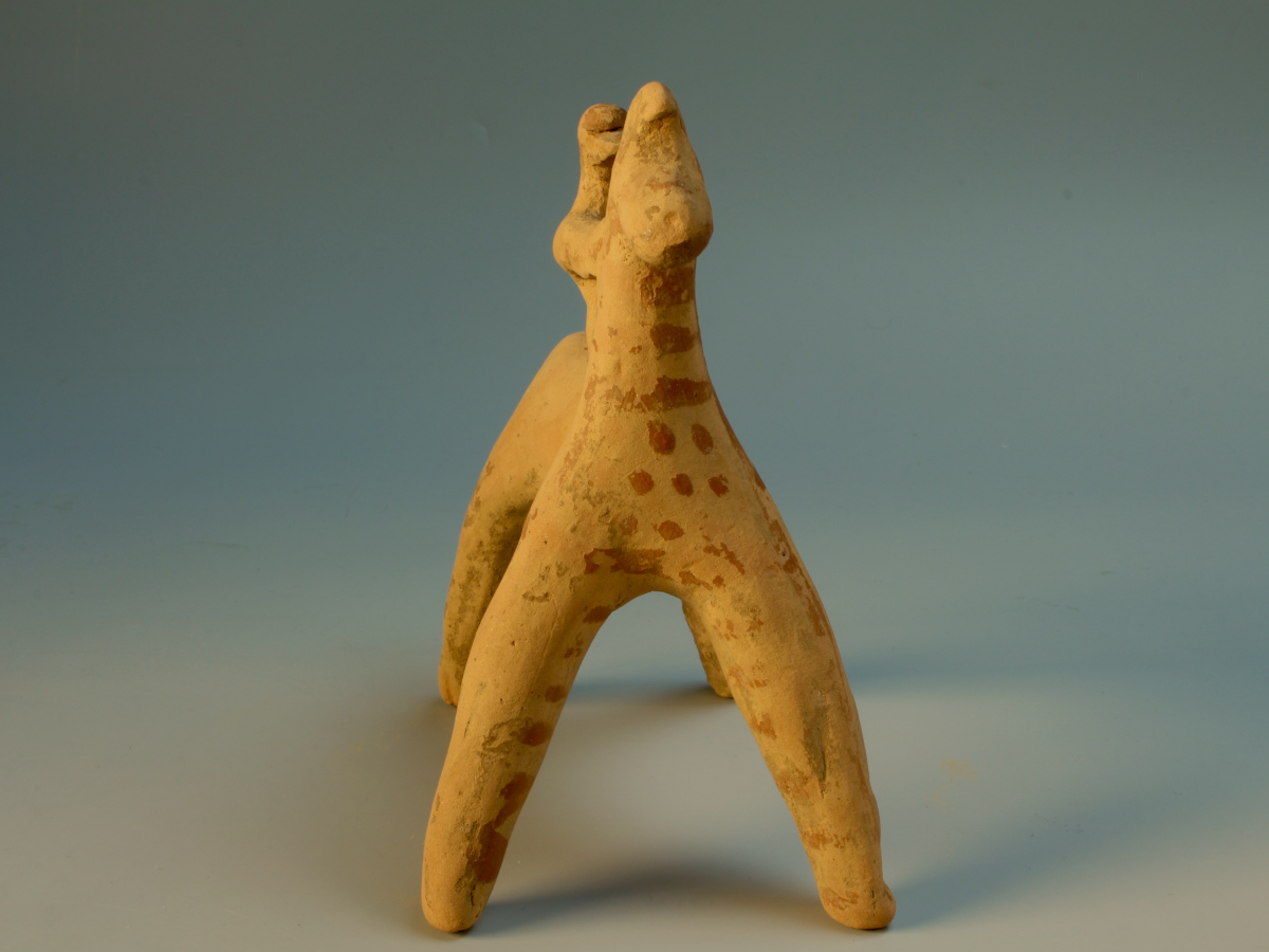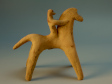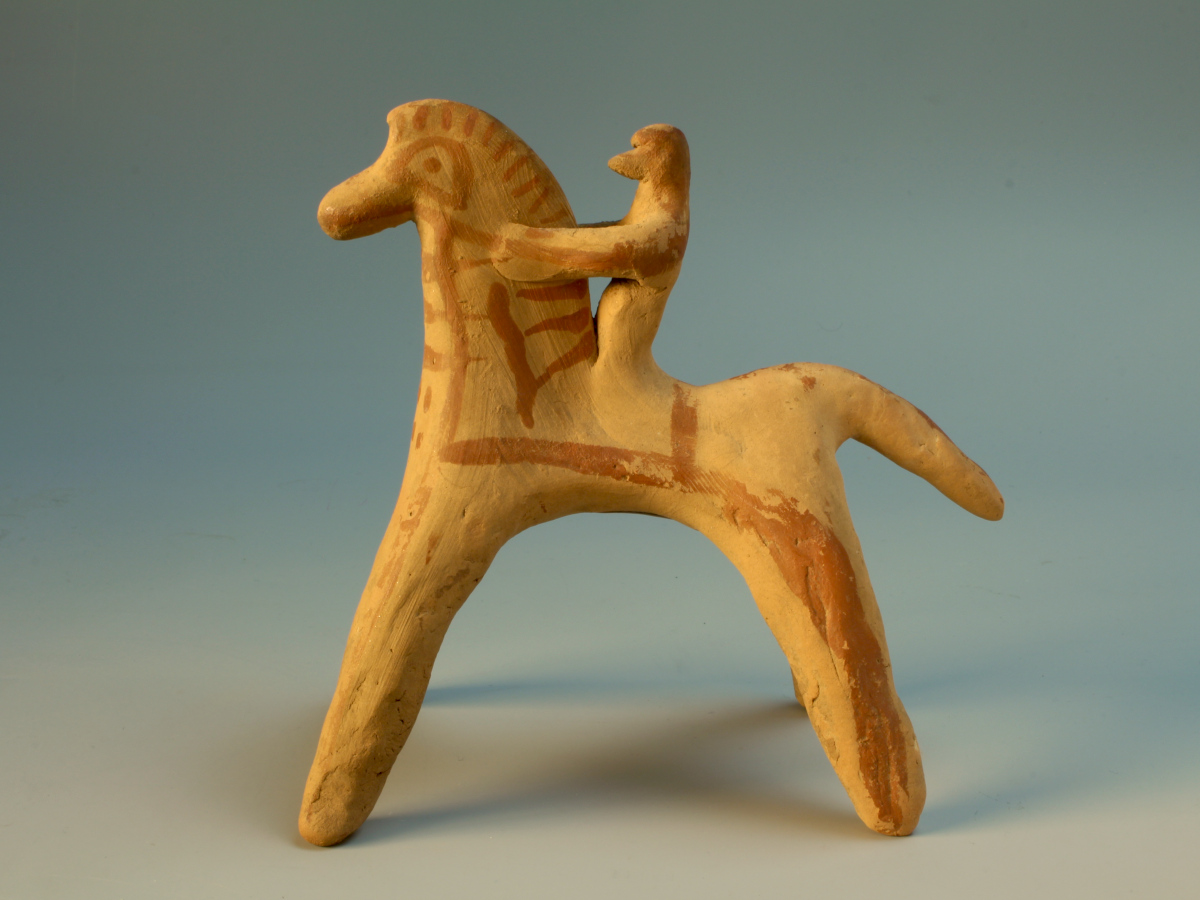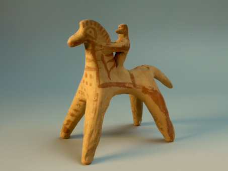 A hand-modelled and stylised statuette of a horse and rider. Although in these depictions the rider usually "merges" with the horse, he is thought to be sitting astride on the back of the animal. He seems to be clutching its long neck, but a painted line on the side of the animal's head may in fact indicate that he is holding the reins. The details of the horse's eyes and mane, as well as the harness of the animal are painted in red, as are decorative bands along the body and legs.