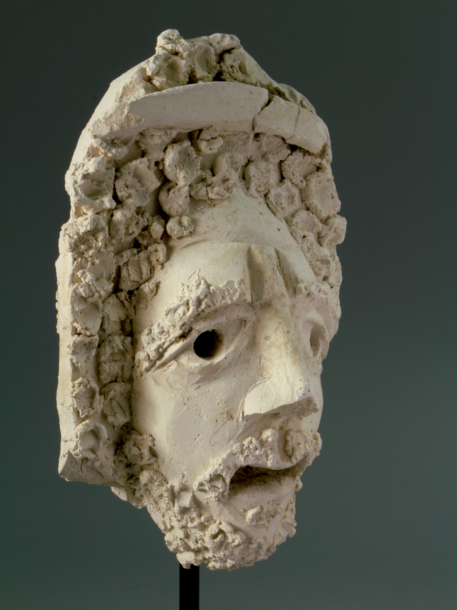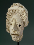 An expressive mask of a man, carved in deep relief. Probably the most striking element are the downward slanting, penetrating eyes, which have deeply recessed pupils and are framed by thick curly eyebrows. The mouth is slightly open and is framed by an applied curly beard. The brow and forehead are deeply furrowed. The hair is modelled with applied tight curls, framing the face, and piled high with a fillet across the top.