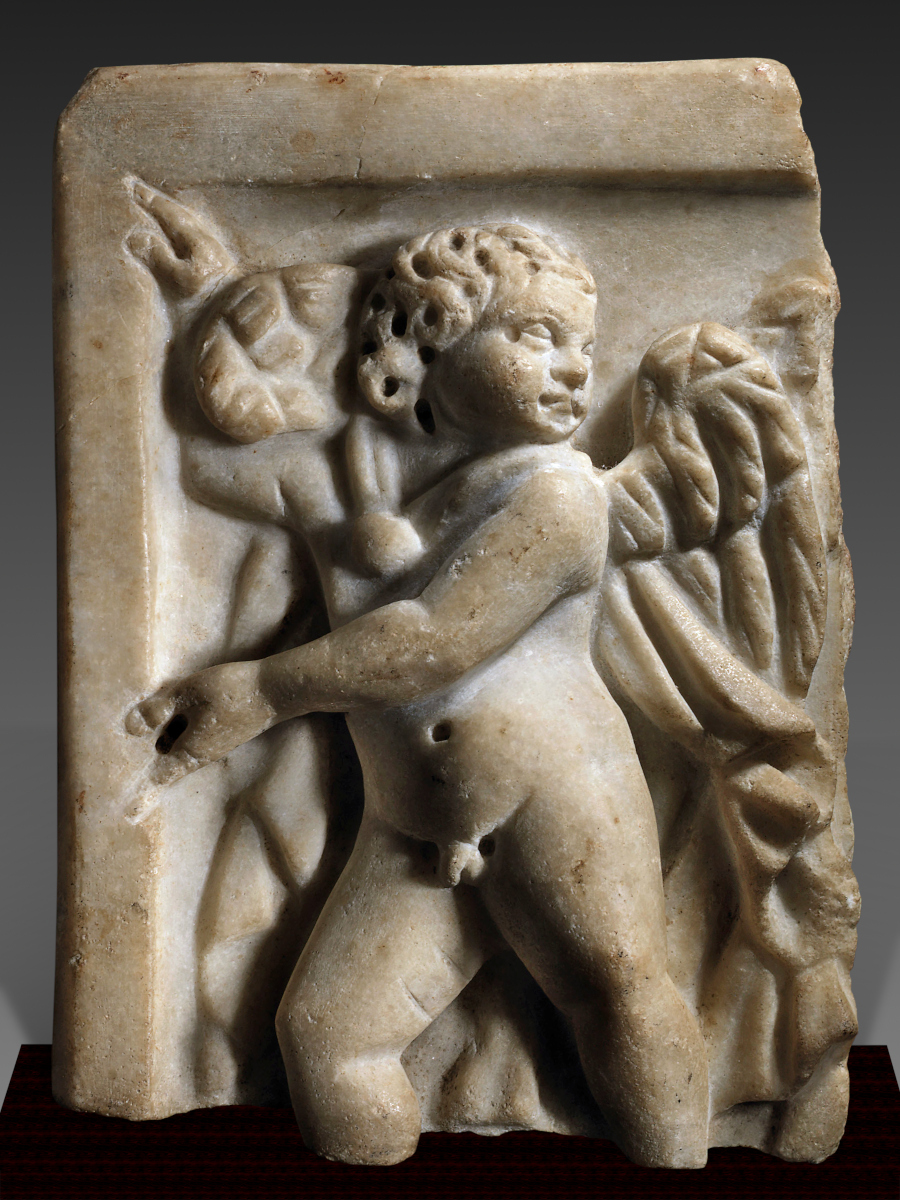 Depicting the god Eros-Cupid, who is shown as a naked young boy, winged and in a striding position, walking to his right, looking back over his left shoulder. His hands are shown in a surprising way, touching the frame of the scene as if the young god is ready to step out of the scene, or is holding or pushing the frame.