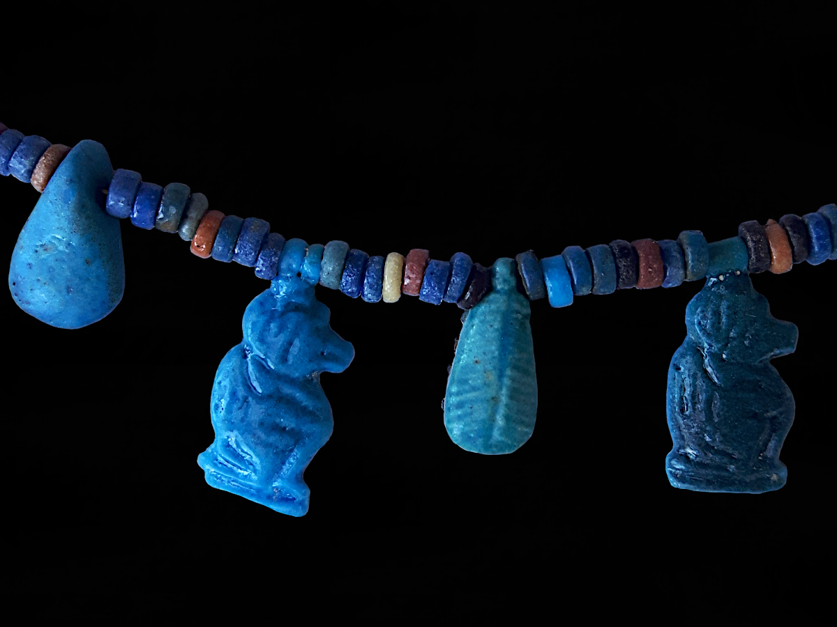 Restrung as a necklace with a modern 18 carat clasp; all components are intact and in excellent condition overall. The help and advise of a specialist Egyptologist was sought to make sure that all components are from the New Kingdom, rather than a mix of elements that belonged to different periods.