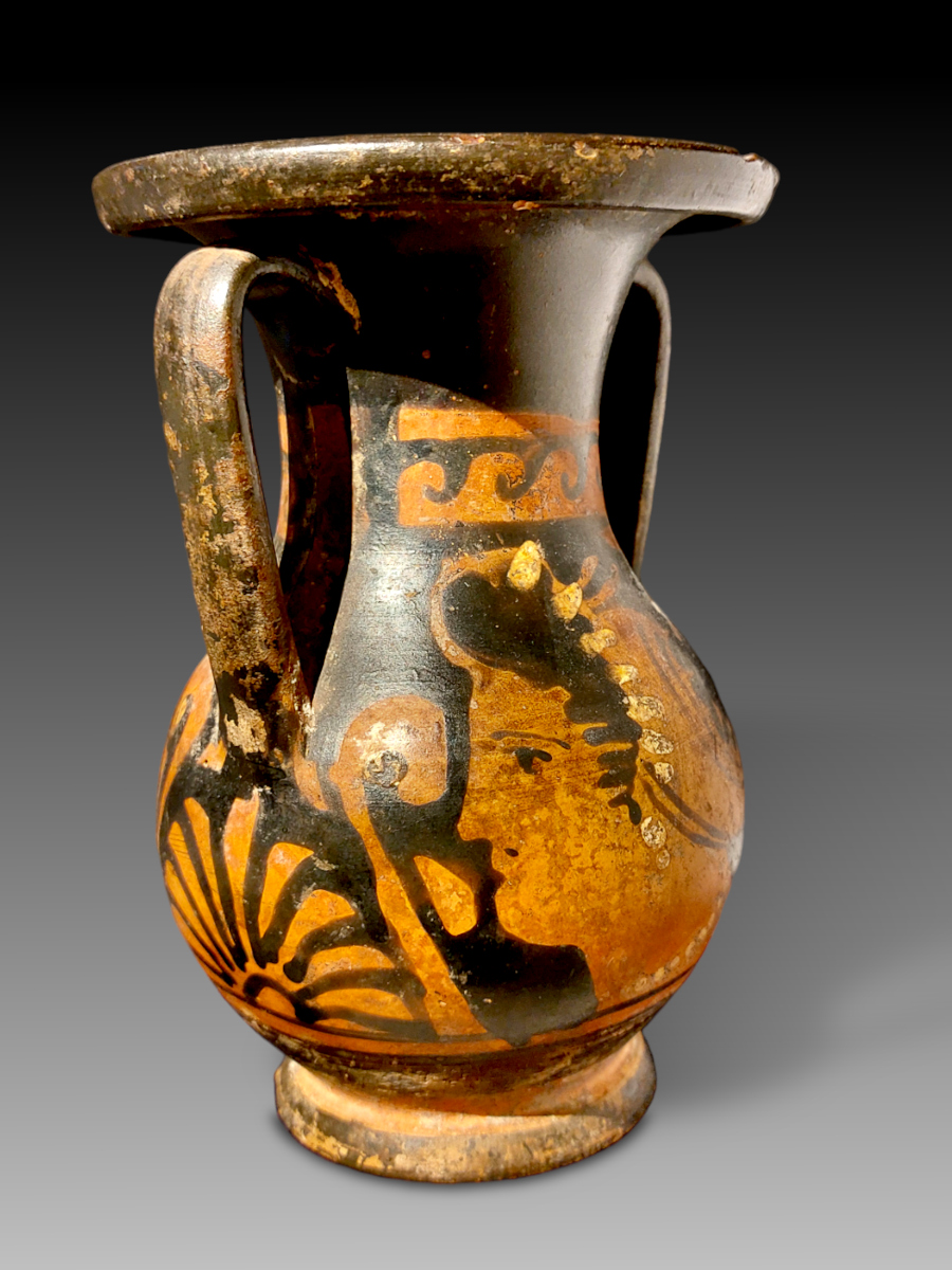 A pelike with a flared mouth, decorated on both sides, in a somewhat hasty style, with the head of a Lady of Fashion. Her hair is dressed in a kekryphalos. She is wearing a radiate stephane in applied white, beaded earrings and a necklace. Under each handle a palmette is shown, flanked by scrolls.