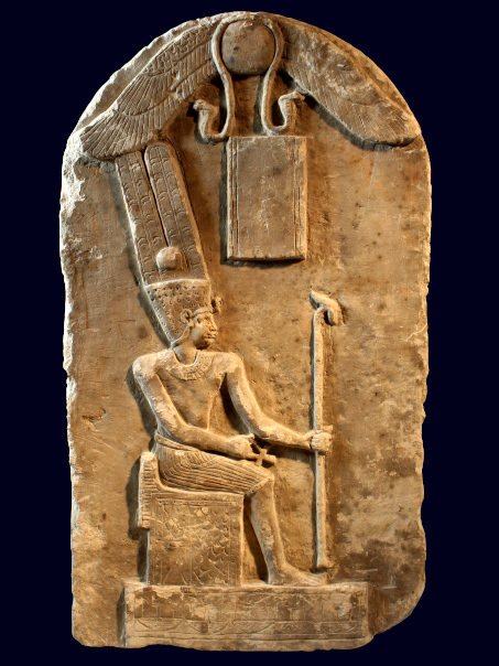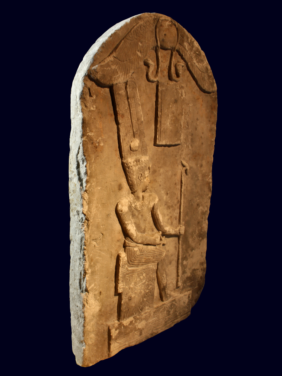 An important limestone stela with a rounded top, depicting in raised relief the god Amun-Re, king of the gods, seated on a throne. He wears a striped shendit (short skirt), and around his neck a collar is visible. On his head he has his typical crown, which is similar in shape to the red crown, and is topped with two tall feathers and a solar disc at the base, illustrating Amun’s origin as god of the air and his link to the sun god, which can also be seen in the frequent appellation Amun-Re. The crown itself is decorated with many small dots, and a uraeus is visible on the forehead of the god.