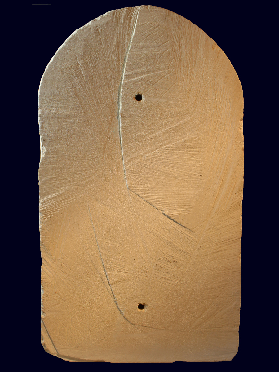 The stela shows some minor chipping and is slightly abraded, with encrustation; chipped around the edges; two holes drilled in the backside, probably to hang the stela on the wall in a frame.