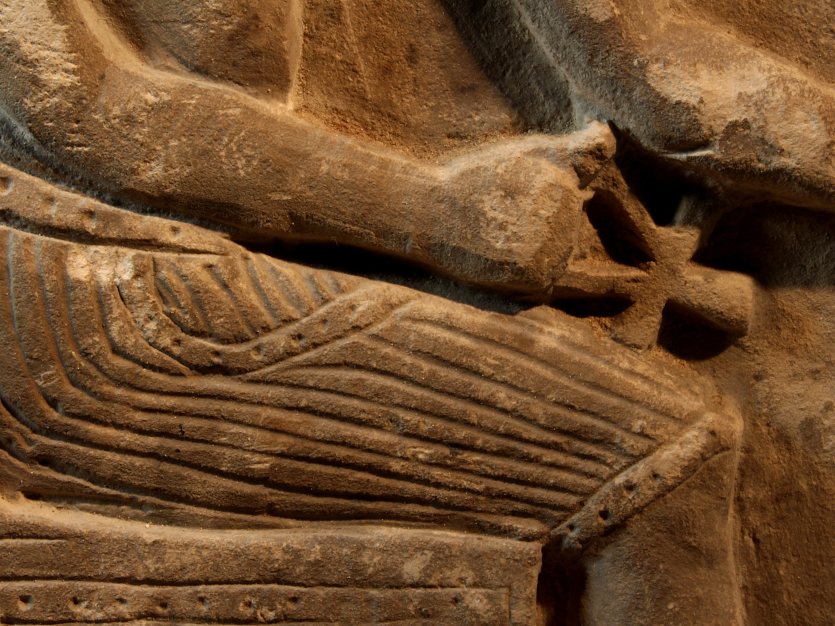 Above the god, next to the feathers, is a rectangular area (sometimes indicated, not quite correctly, as a tabula), designed to contain a short inscription, which was usually the name of the god in question; the area is now empty, but possible the text was originally painted or written and was later erased or lost, as were the colours on the rest of the stela.