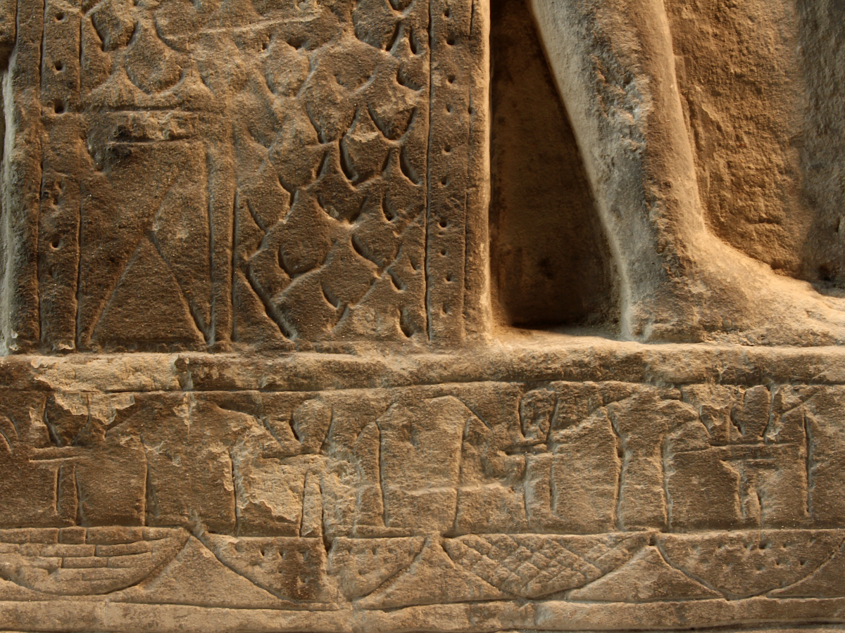 In his right hand the god holds an ankh (symbol of life) and in his left hand he holds a large was-sceptre (symbol of power and authority). Both symbols are also repeated on the dais below.