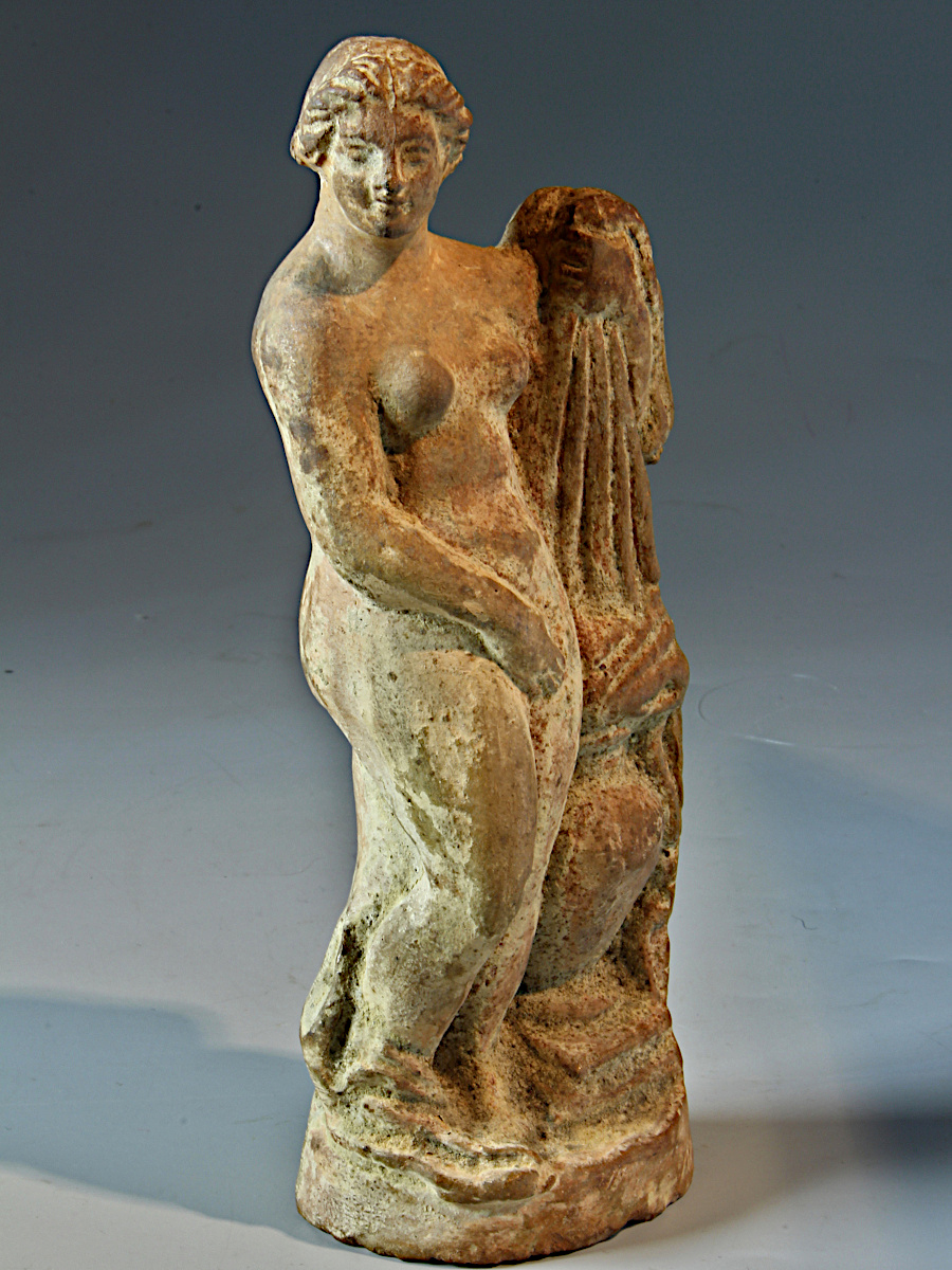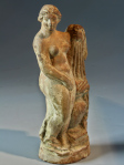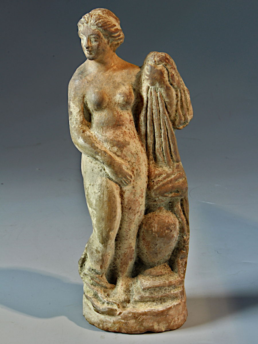 A terracotta statuette showing the goddess Venus (Greek Aphrodite); she is depicted naked, holding drapery with her left hand, and covering her pudenda with her right hand. On her left hand side an amphora is visible.