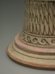 This pottery object was matt-painted, as was customary for Daunian art. The lower part, or base, displays a net-like design of crossing lines between two bands of waves. The upper part has a decoration of seven friezes, the top one containing waves and the others with vegetal and geometric decoration (such as ivy, metopes with saltires (Saint Andrew’s crosses) and ovolo). The bowl is decorated with a rosette surrounded by dots and nets, with metopes with saltires on the rim.