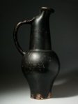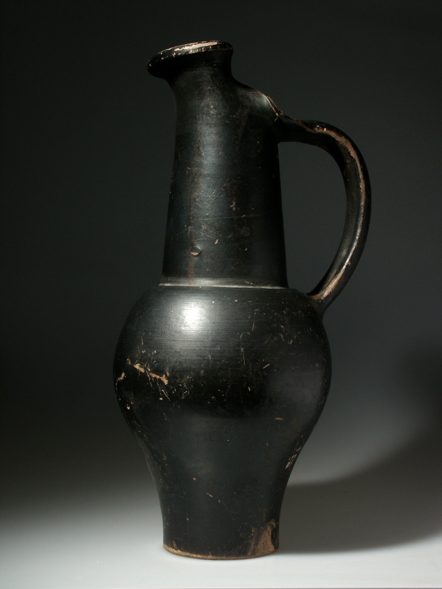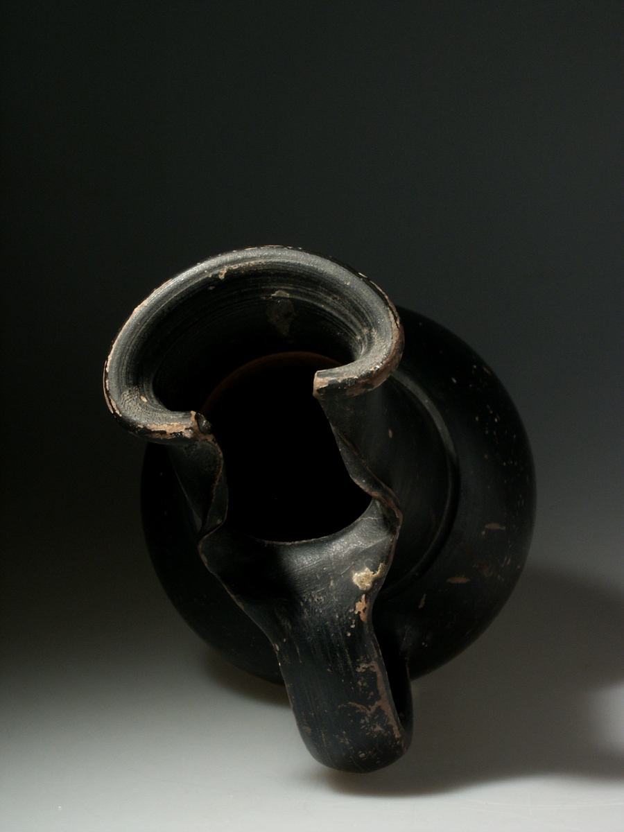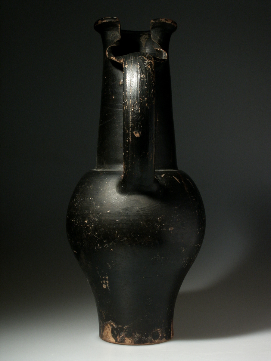 This is a large and very elegant Etruscan beaked oinochoe (a jug used to pour wine). This larger than usual vessel is black-coloured has a wonderful shape. One of the previous owners even compared it to a belly dancer(!). In some aspects of its shape it resembles a modern work of art, but it is an authentic ancient object, that will display wonderfully! Quite an attractive vase.