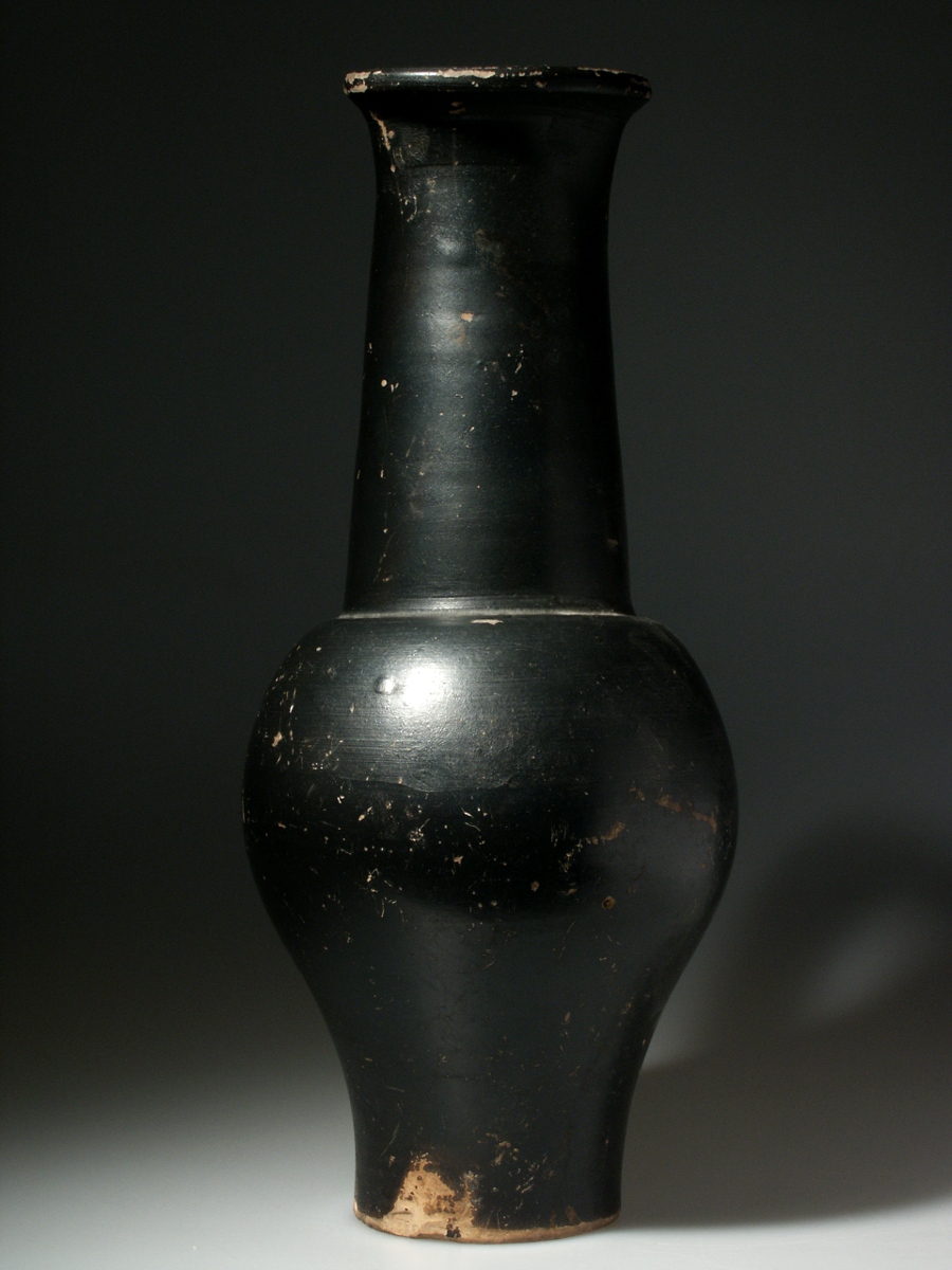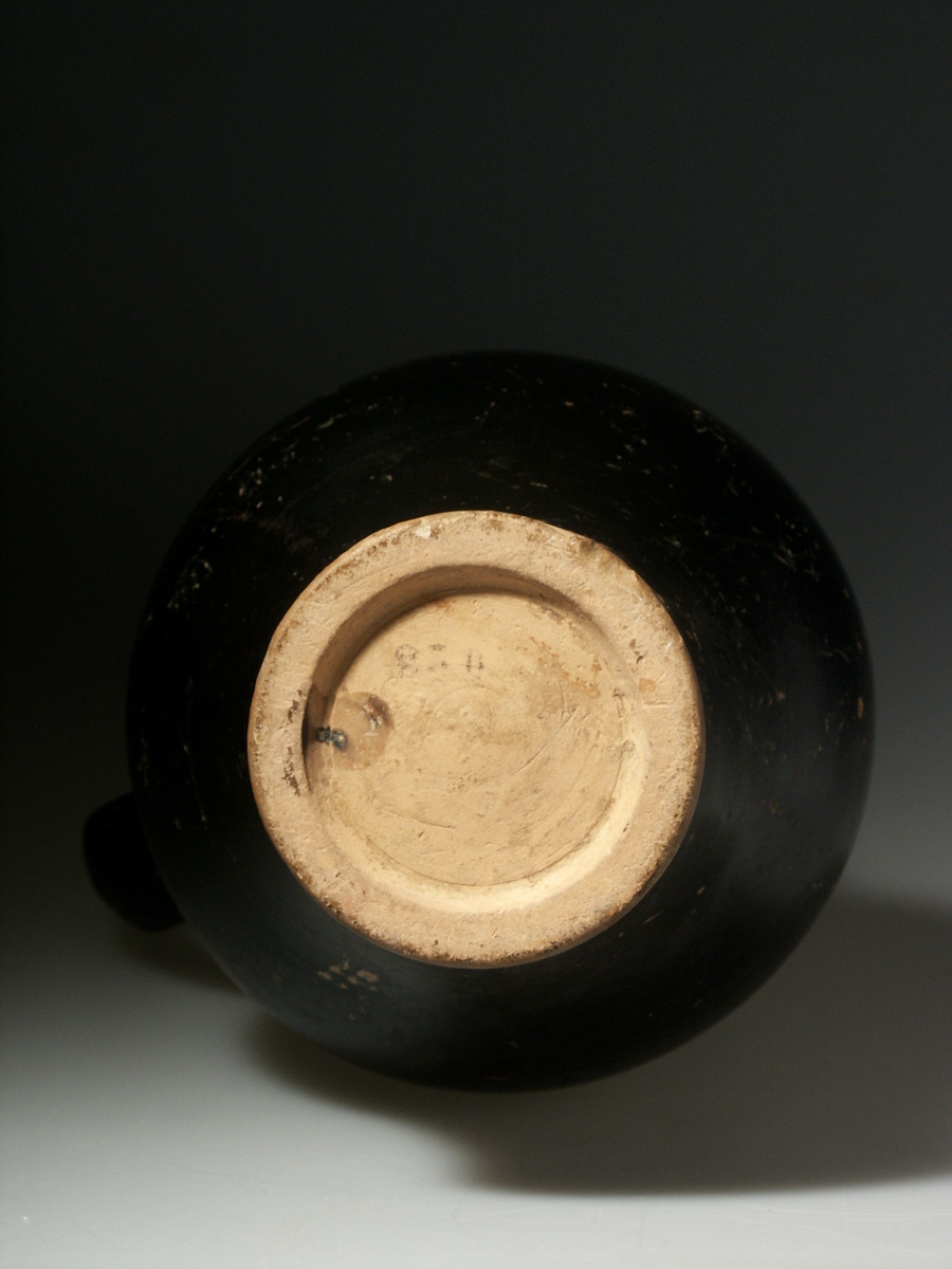 A few tiny chips to the base, some scratches and wear, resulting in some loss of the black colour, as is customary with ancient vases; handle professionally reattached, almost impossible to see; else intact.