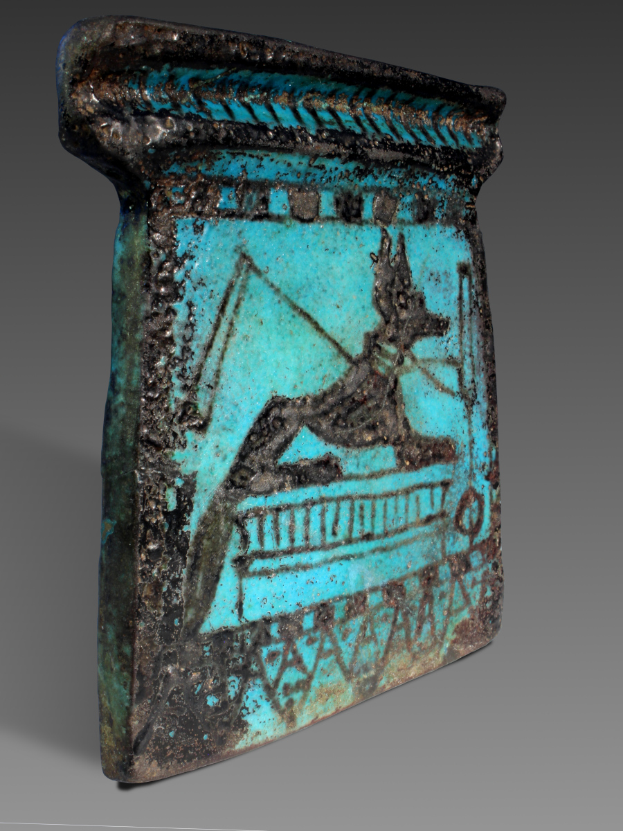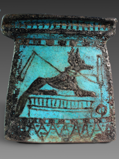 This is a pectoral of glazed faience with a magnificent blue-green colour and decoration in black. Pectorals were put around the neck of mummies, on the chest, and were usually decorated with images of funerary gods and regeneration symbols, as is the case on this specimen.