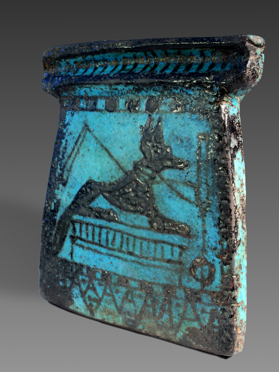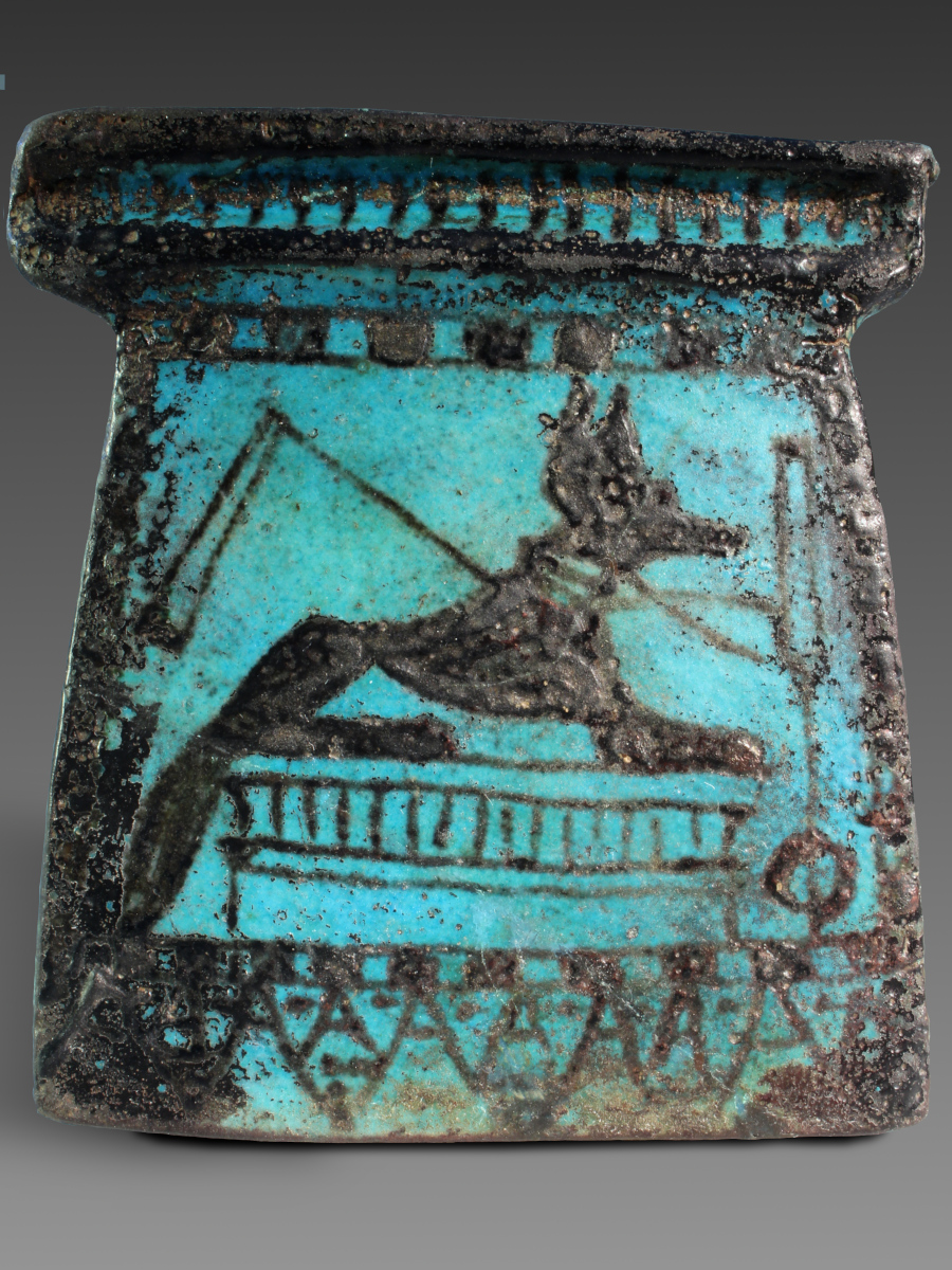 Depicted is a jackal, the god Anubis, with a ribbon around his neck, a sceptre of power (sekhem) vertically in front of him, which appears to be resting on a shen-ring (symbol of eternity), and a flagellum behind his head. The jackal is reclining on top of a shrine. Please note that the pectoral itself also has the shape of a shrine. The whole scene is depicted on top a of a stylized frieze of lotus flowers.