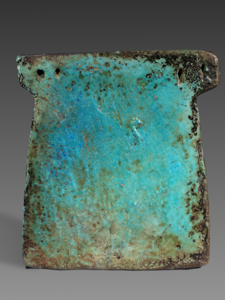 As visible on the photographs parts of the faience show some discoloration (especially along the edges); the lower left corner was broken off and has been professionally rejoined. Comes with an acrylic stand. A wonderful warm colour!