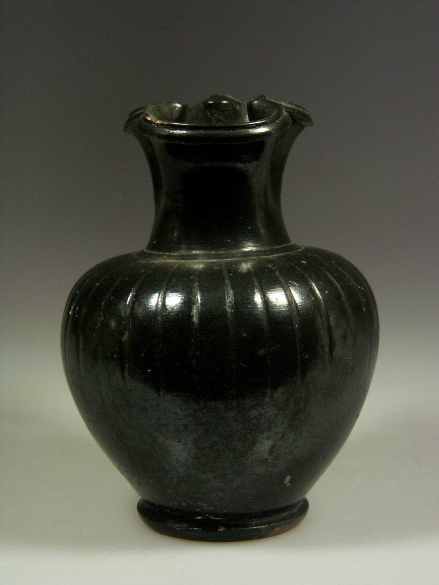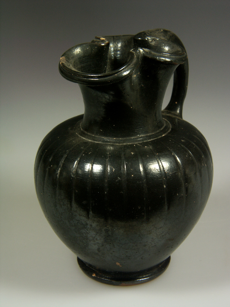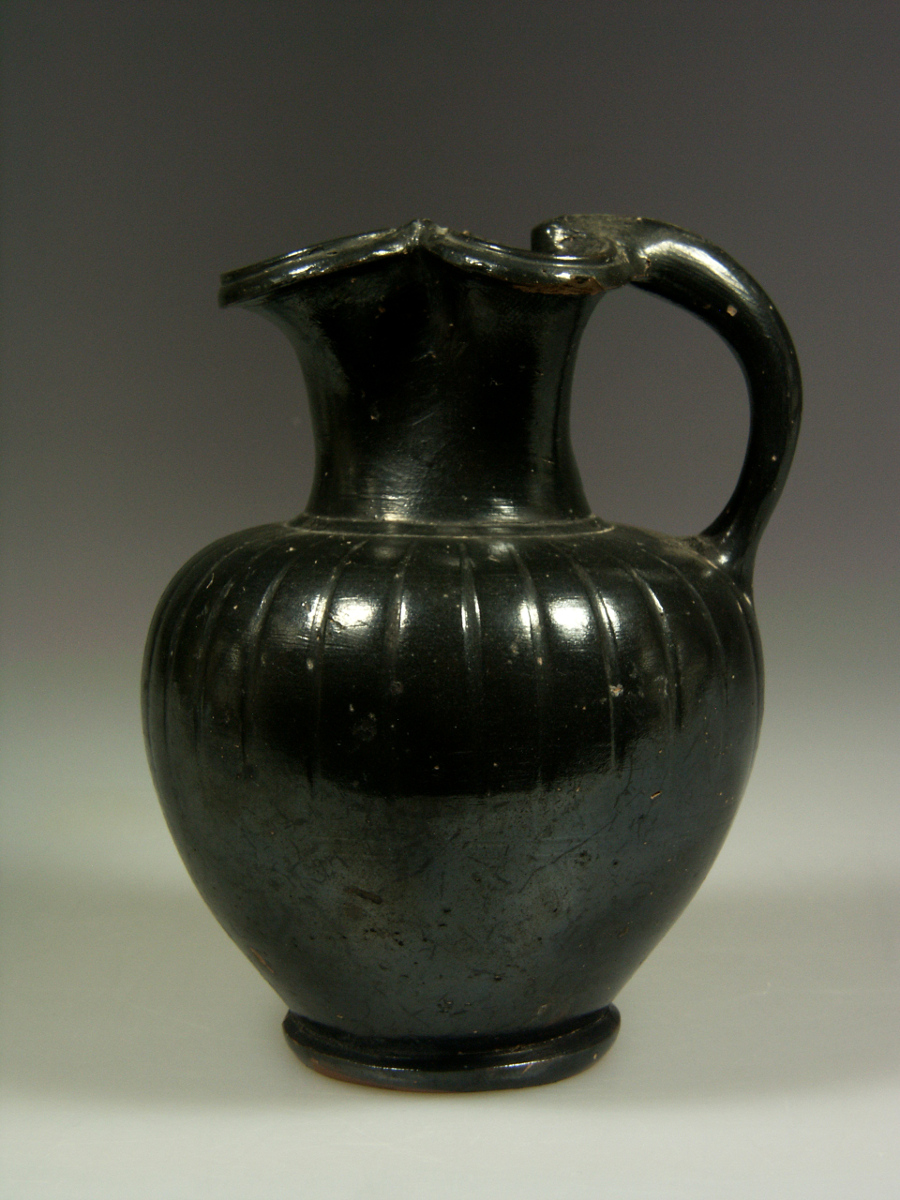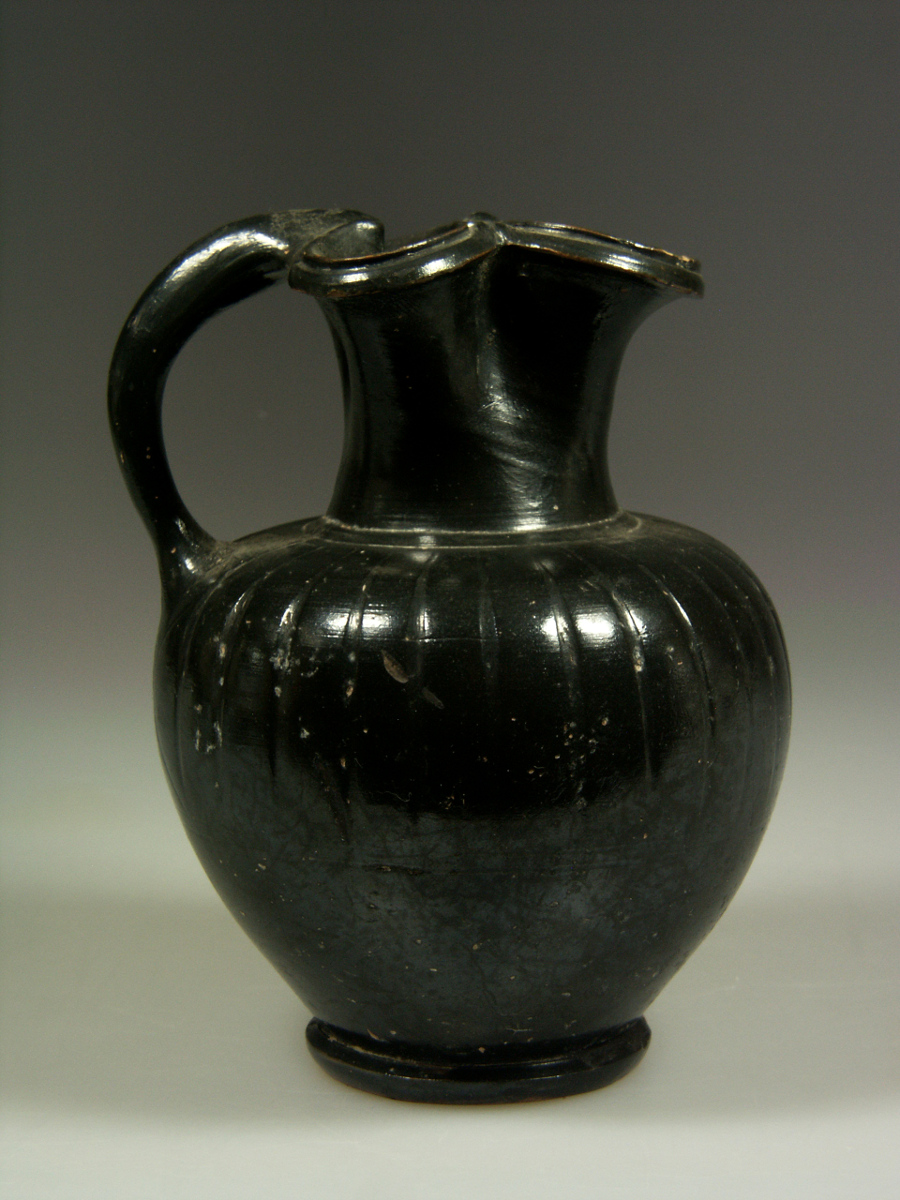 This is a beautiful oinochoe (wine jug), made in southern Italy in circa the 3rd century B.C.; probably it is from the Greek colony of Campania. The vessel has a bulbous body with an elegant design. The black metallic glaze is of a very fine quality, giving the vessel a marvellous smooth exterior surface. With a trefoil spout, a strap handle and on the shoulder a pattern of vertical linear incisions.