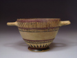 The cup is decorated on the exterior upper half, at the level of the handles, with ornamental bands with vertically applied wavy lines, and horizontal lines with two rows of dots below. From the foot a corona of rays reaches upwards to another series of horizontal lines, these also with two rows of dots.