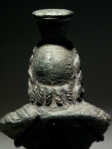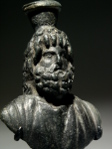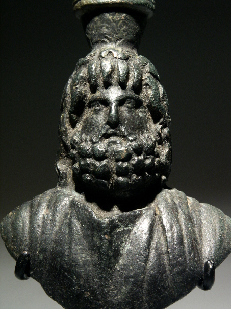 In this bronze statuette the god is depicted in the usual way, as a Greek god with a full beard and long free-flowing hair, including characteristic vertical locks on the forehead. He has a conical modius on his head, adorned with olive branches. The modius is a basket or measure for grain, symbolizing fertility of the earth and linking the god with Osiris. The bust is supported on a stylised lotus flower, linking him with the sun.