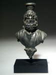 Intact with a dark patina covering almost the whole bust except in a few tiny spots where the underlying bronze is shining through; a very small triangular area (2 mm maximum width) of damage to the rim on the back side, near the left shoulder (as visible on the photograph); some incrustation; a few miniscule dents; comes with a custom made stand.