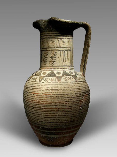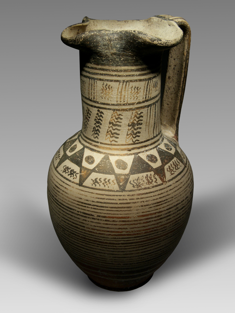 For the shape of the oinochoe and its decoration with horizontal stripes compare John Boardman, Early Greek Vase Painting, 11th - 6th Centuries BC. A Handbook (London, Thames and Hudson, 1998), fig. 114 and 119; J.N. Coldstream, Greek Geometric Pottery. A Survey of Ten Local Styles and their Chronology (Methuen’s Handbooks of Archaeology) (London, Methuen, 1968), pls. 19 b-c (Corinthian) and 36a (Naxian). For the decoration with triangles pointing in opposite directions see for example a (differently shaped) vessel from Crete, Coldstream, o.c. pl. 53g; for the decoration in general compare Boardman, o.c. fig. 113.