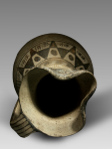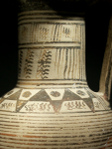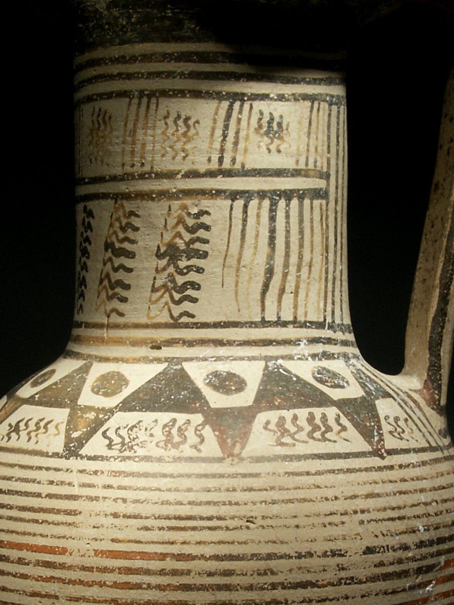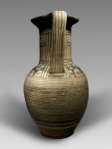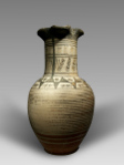 This is an early oinochoe (wine jug), dating to about 720 B.C. and of western Greek origin. The body of the vessel is decorated with a series of horizontal stripes. On the shoulder is a frieze, consisting of two registers; the upper register is filled with an series of triangles, pointing upward, alternating with circles or dots; the lower register contains another series of triangles, this time pointing downward, and zigzag lines. The neck also shows two registers, framed by several horizontal stripes, and each containing zigzag lines and groups of vertical lines. On the handle seven vertical stripes. The outside of the mouthpiece is black.