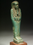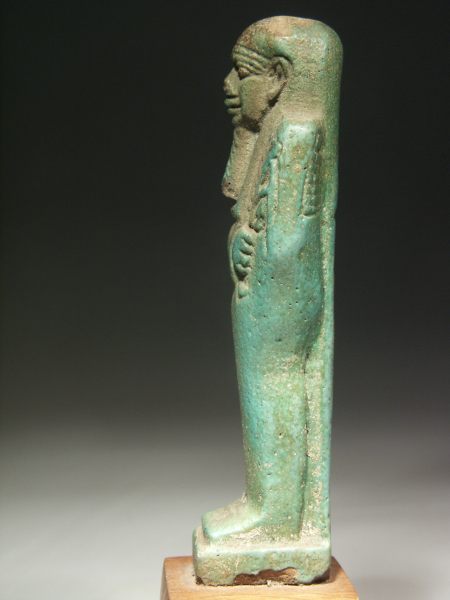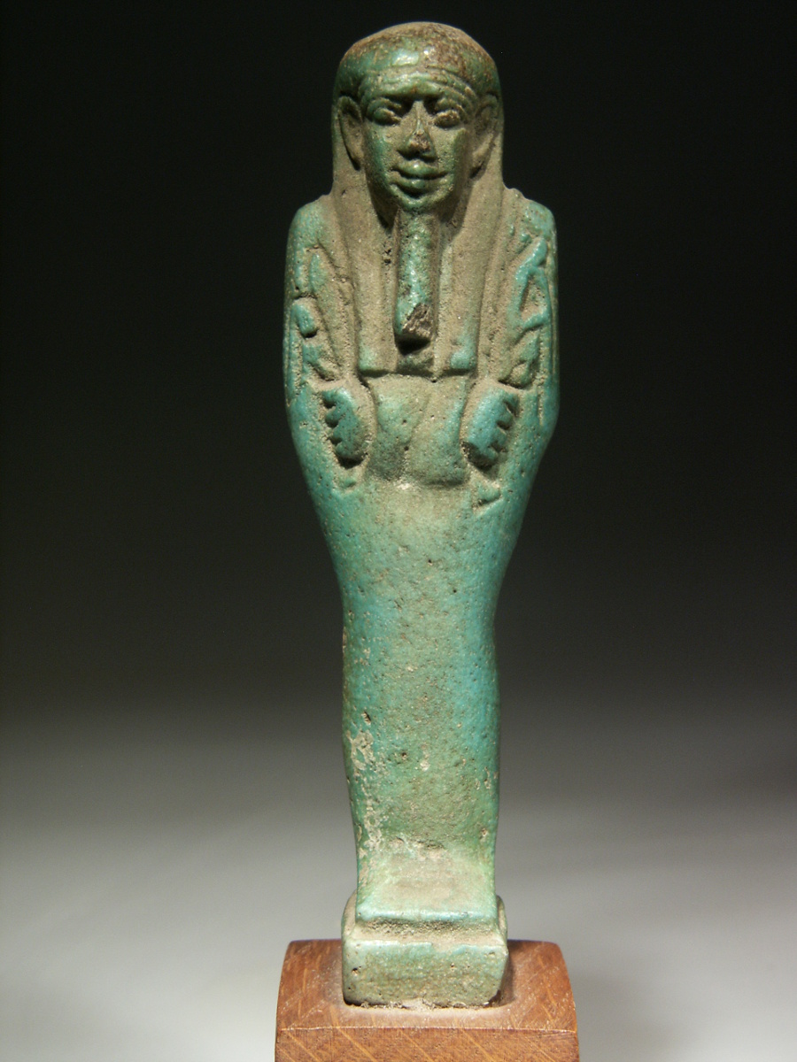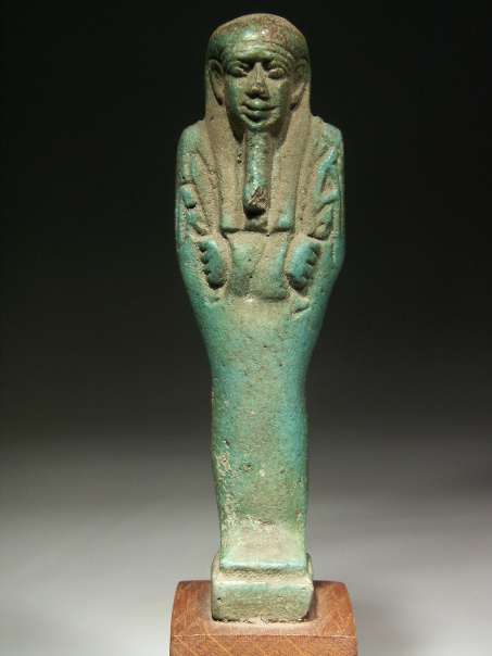 This is a beautiful composite shabti with well defined details and a lovely, warm turquoise-green colour. His smiling face gives him an enormous "presence".