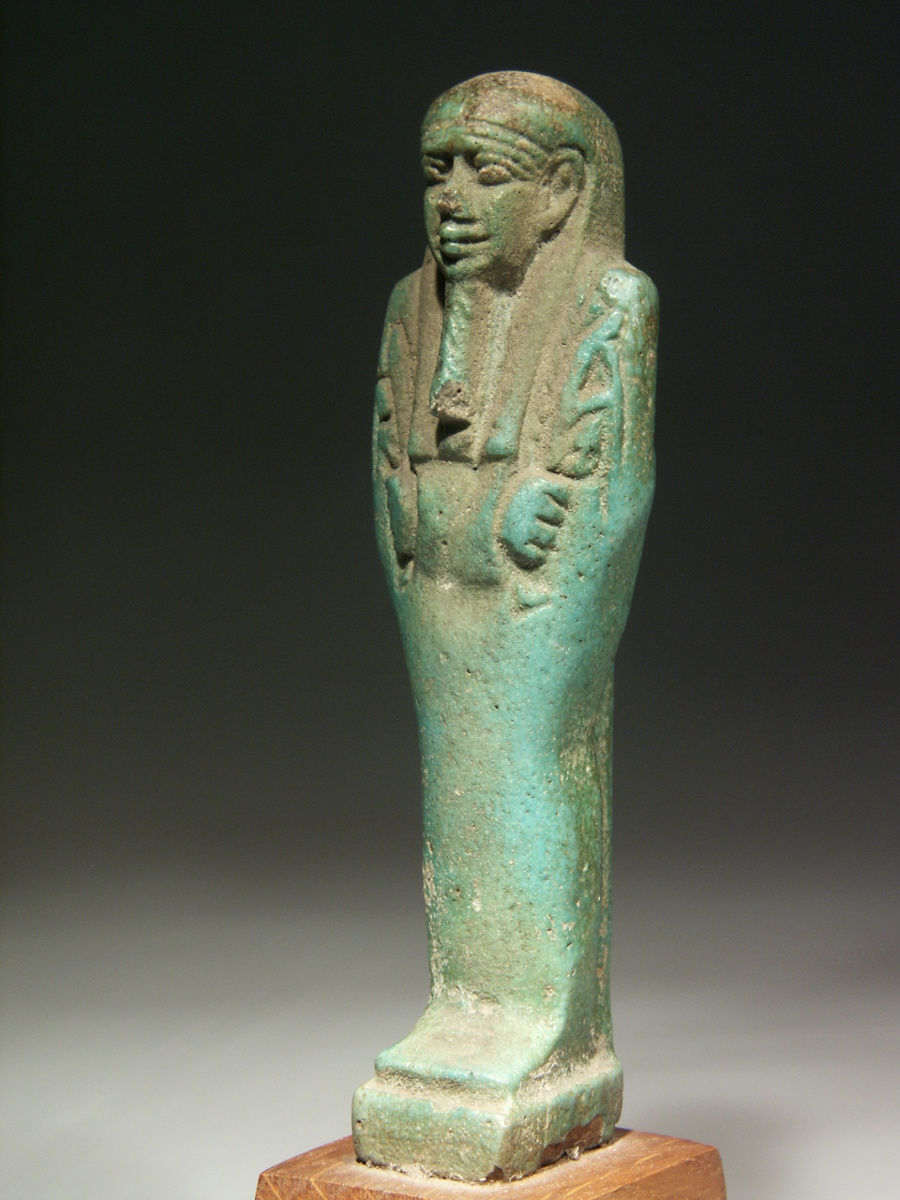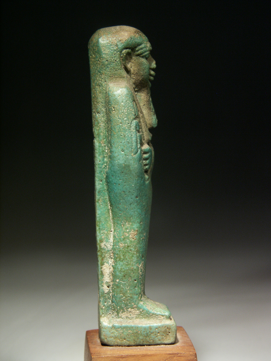 Some encrustation and discoloration, a small chip to the tip of the beard and the nose, a little damage to the plinth, some surface wear; all as visible on the photographs. The shabti has a beautiful colour.