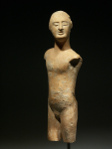 This is a lovely work of art made of orange-brown clay. It is much older than the average terracottas one encounters: it dates to the Greek Early Classical Period, and is probably Attic; it is therefore quite unusual and without many parallels.
