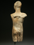 Details supporting a dating in the Early Classical Period are the elevation of the right shoulder and the slightly advanced right leg. In addition to this specialists have pointed at the pronounced turn of the head in contrast to the strict vertical plane of the frontally rendered upper body; this finds parallels in the central figure of Apollo in the west pediment and in several of the metopes of the temple of Zeus at Olympia (Cf. Heiner Knell, Mythos und Polis. Bildprogramme griechischer Bauskulptur (Darmstadt, Wissenschaftliche Buchgesellschaft, 1990), p. 80 ff., figs. 115-117, 119-120, 124-125).