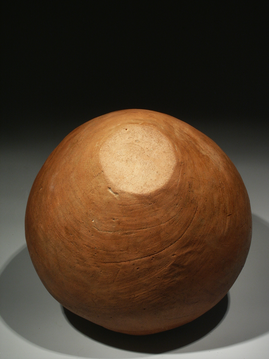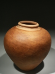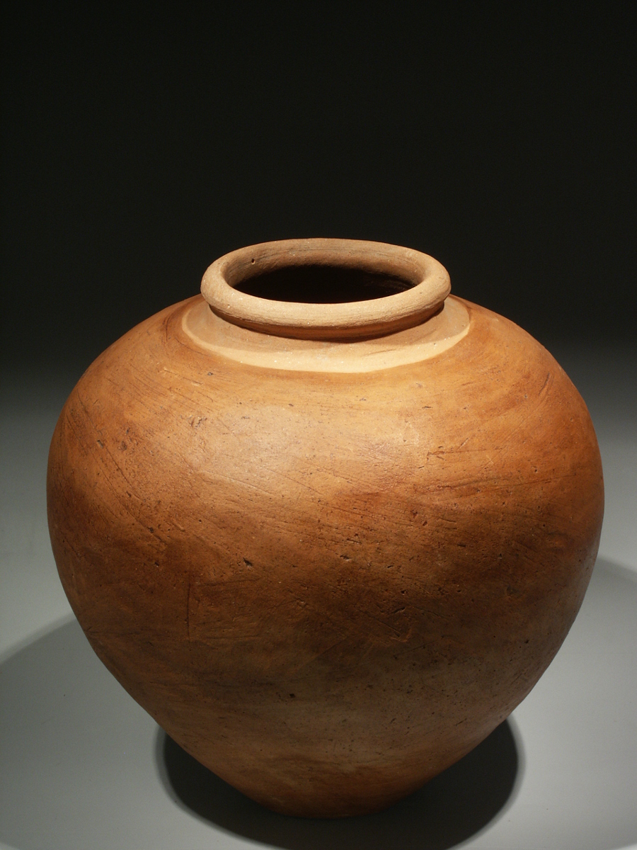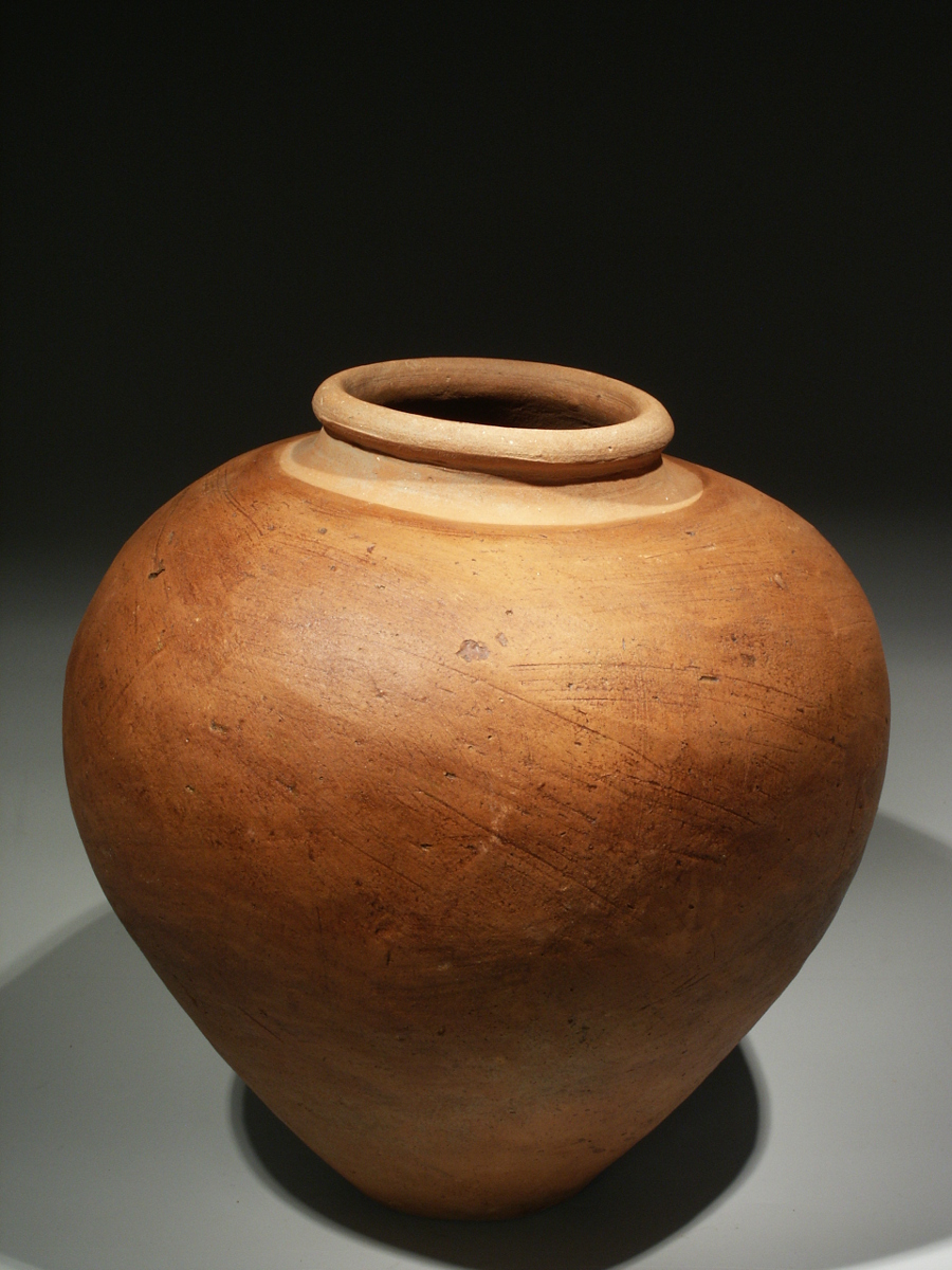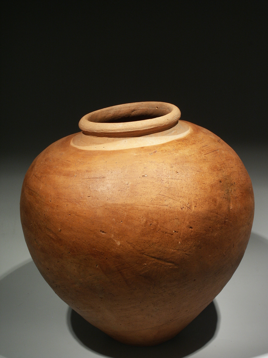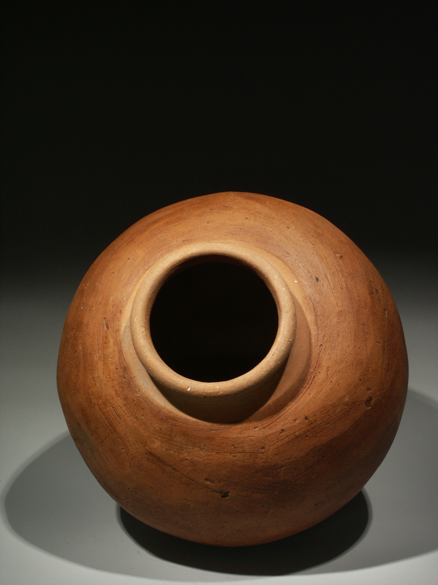 The body of the vessel has a very elegant ovoid shape with a flattened base. The neck of the jar is narrowed with a thick rounded or recurved rim. The sides were smoothed and have been washed with an unburnished red slip, giving the object a beautiful warm, red-brown colour, whereas the area around the mouth has a lighter colour.