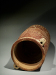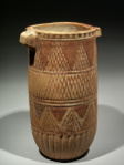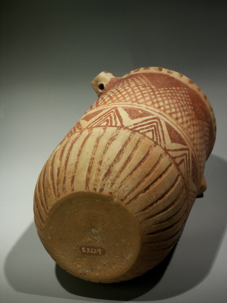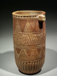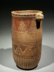 It is a rare buff pottery vessel, wheel-thrown in the shape of a beaker, with two small suspension lugs at the rim. The incurved base is decorated by textured ribbing, to which red-brown paint has been added. Above this there are three registers, separated by horizontal incisions and decorated in red-brown paint. The lower one has a series of triangles in a linear pattern, alternating with solid painted triangles. The middle register has a net pattern consisting of cross-hatched lines, and the top one combines the net pattern and a series of solid coloured triangles. There is a dot pattern in red-brown on the rim.